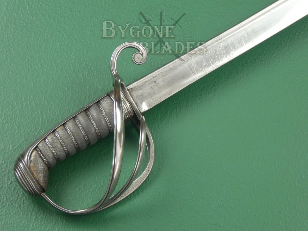 This scarce P1821 British Light Cavalry officer’s sword bears the Royal Cypher of King William IV, dating it to between June 1830 and June 1837.
