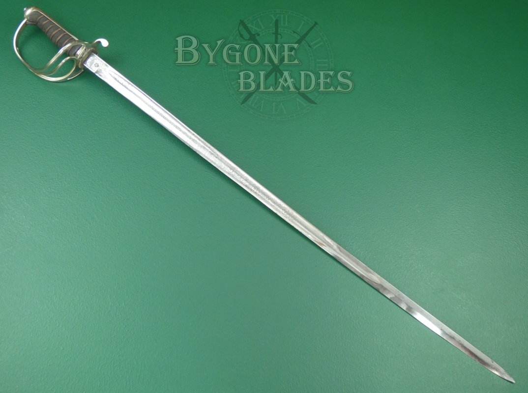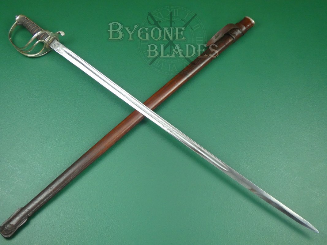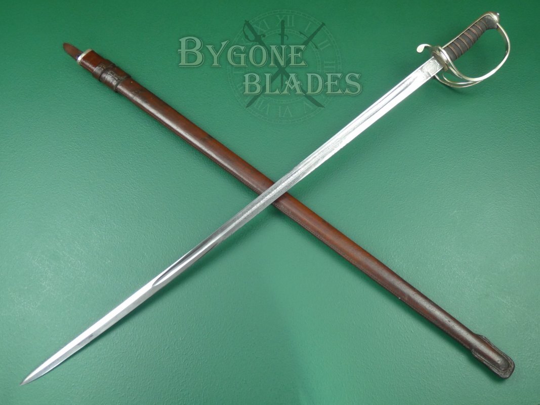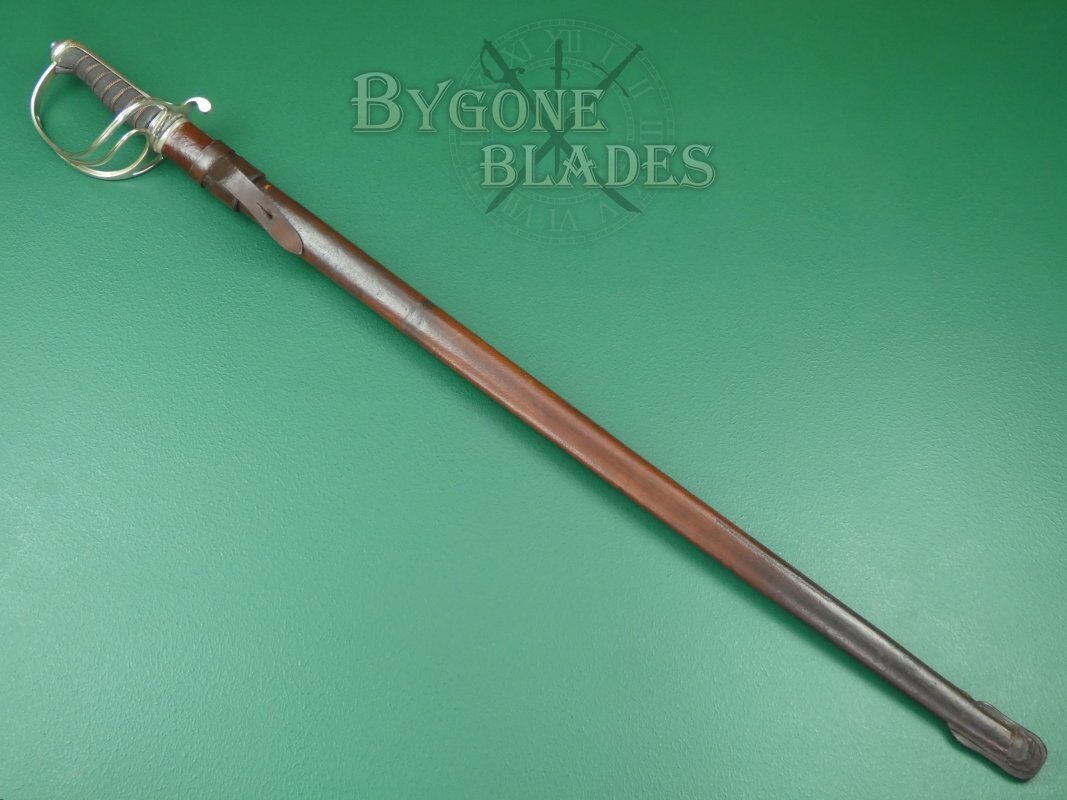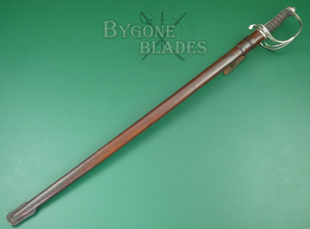 The sword is complete with its brown leather covered scabbard with integral frog and strap. The scabbard is in good condition with some staining and scuff consistent with age and use. There is some creasing to the leather of the shoe. The sword sheathes and draws smoothly and is held firmly within the scabbard.