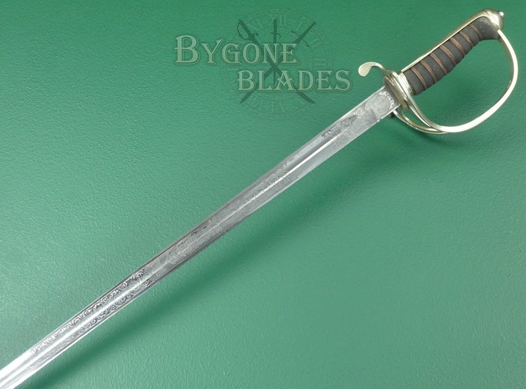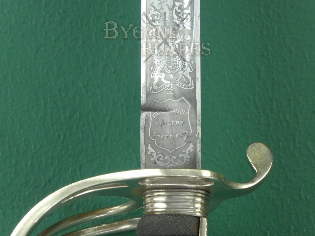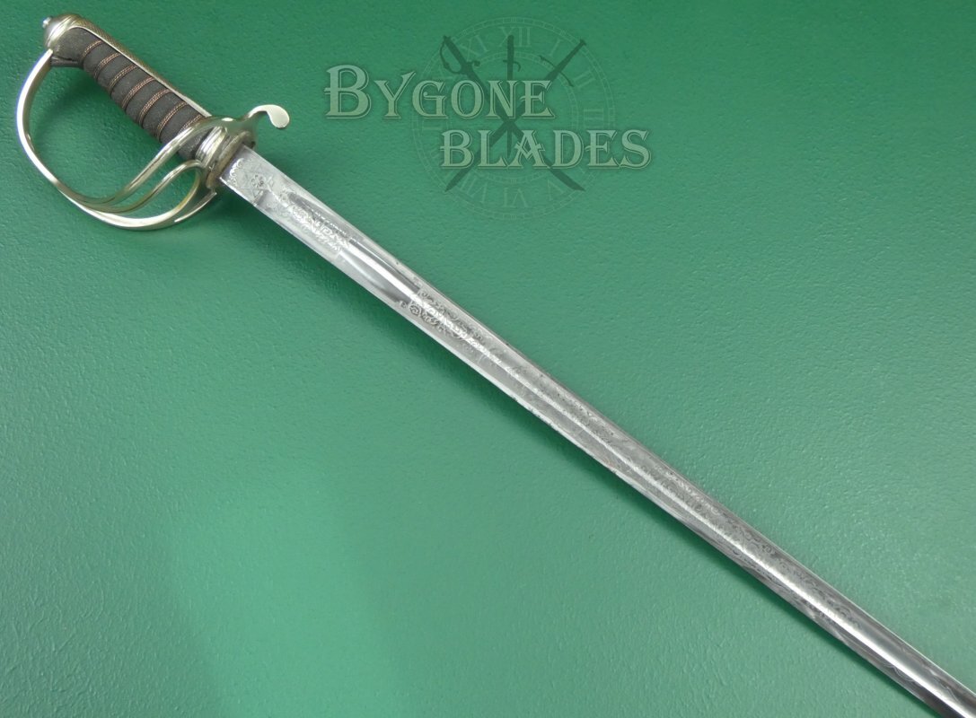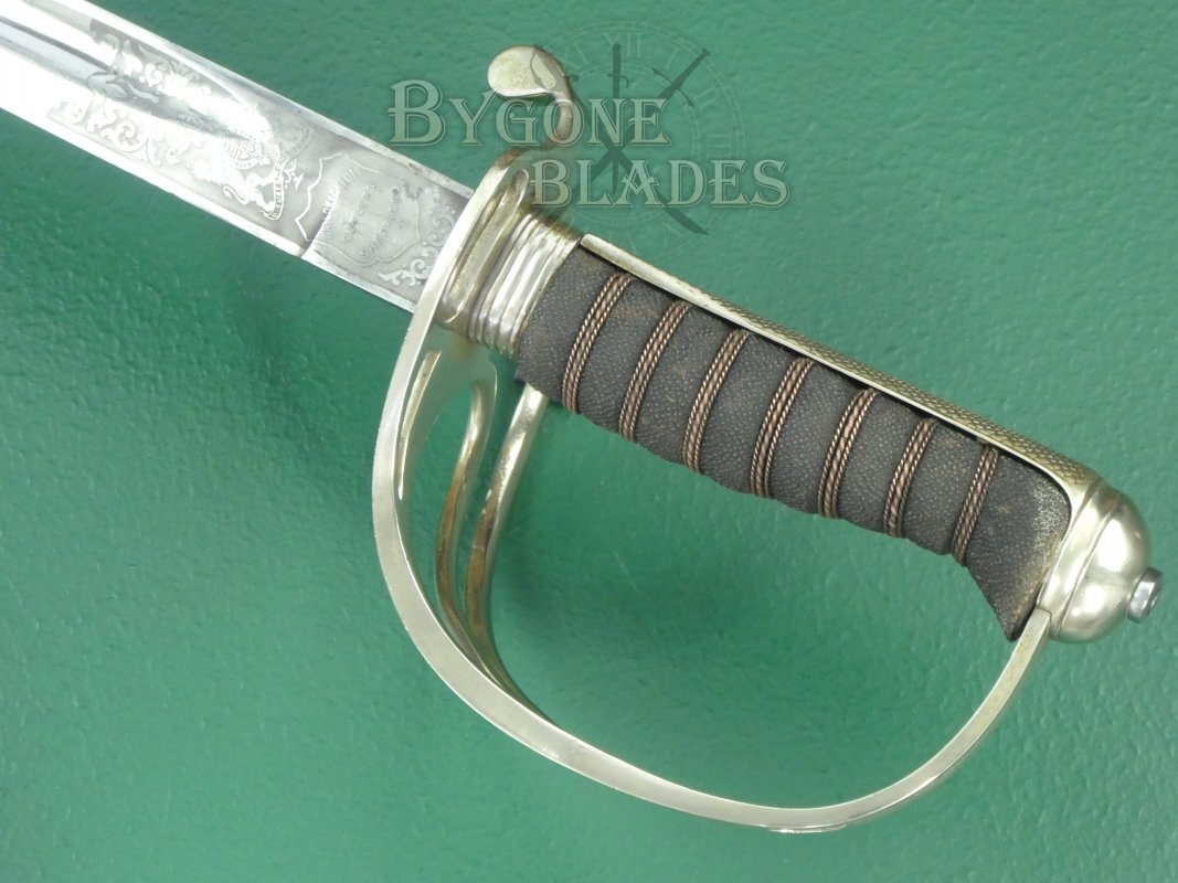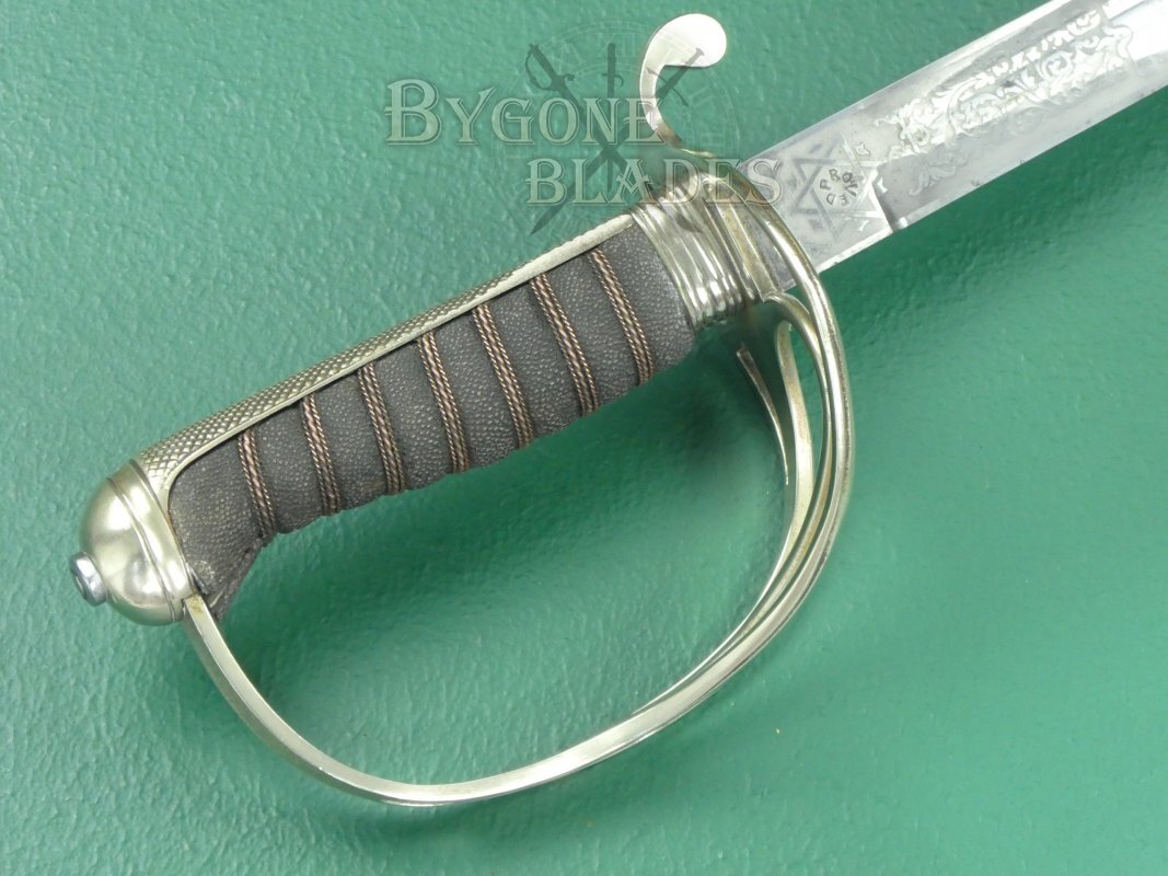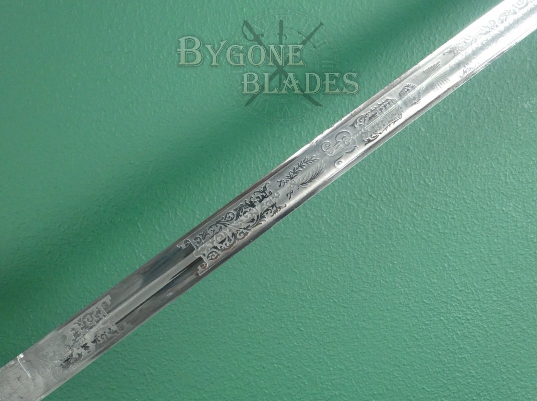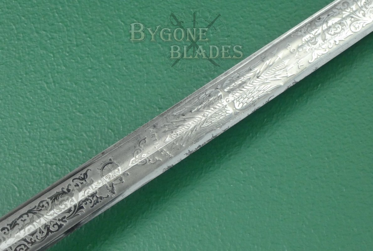 The blade is crisply etched with scrolled foliate panels above the winged lightning bolts with the words “Royal Artillery.” Above a field gun. The ricasso bears etched interlocking triangles containing the stamped word, “PROVED.” The obverse of the blade is etched with similar foliate scrollwork above the rayed crown, Coat of Arms and cypher of King George V who reigned from May 1910 – January 1936. The forte of the blade bears the arms of the Royal Family. The ricasso is etched with the details of the cutlers, Watson & Gillott of Sheffield.