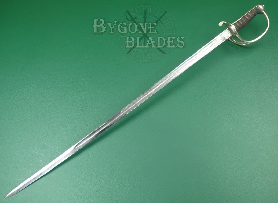 The 890mm blade is single edged with a flat spine over a three-quarter length single fuller. The blade terminates in a spear point and is double-edged for the final 250mm. The blade was service sharpened as required under general order in 1914 at the beginni9ng of World War One.