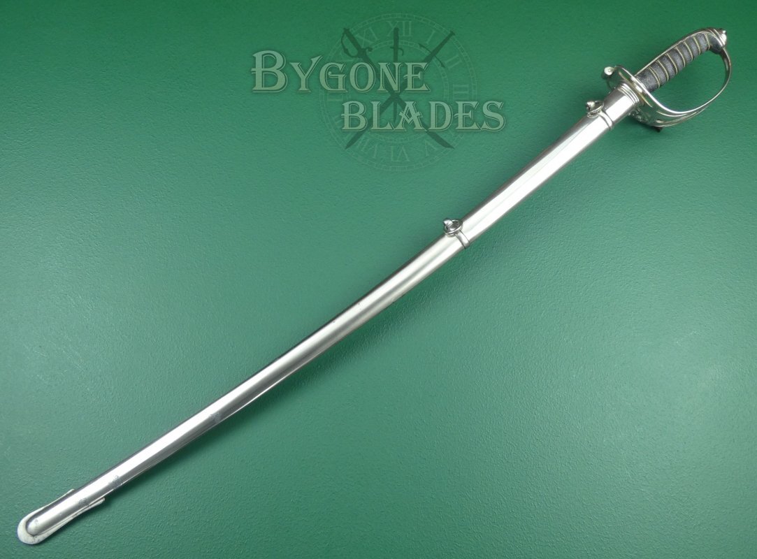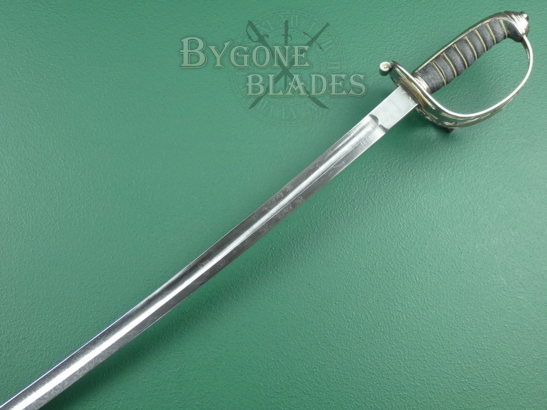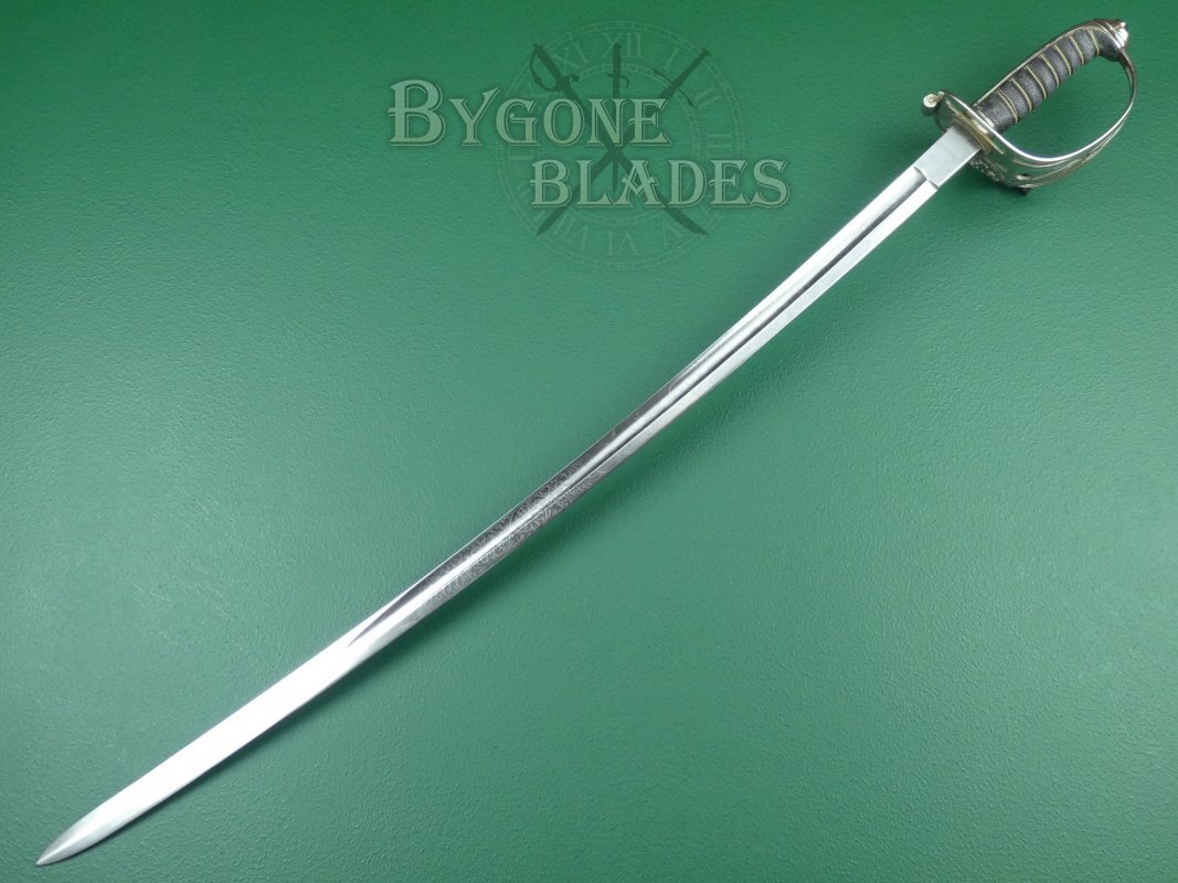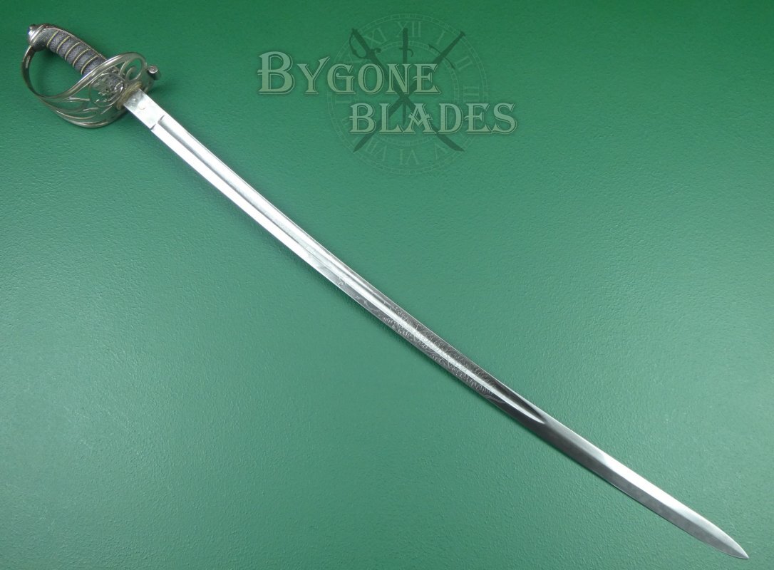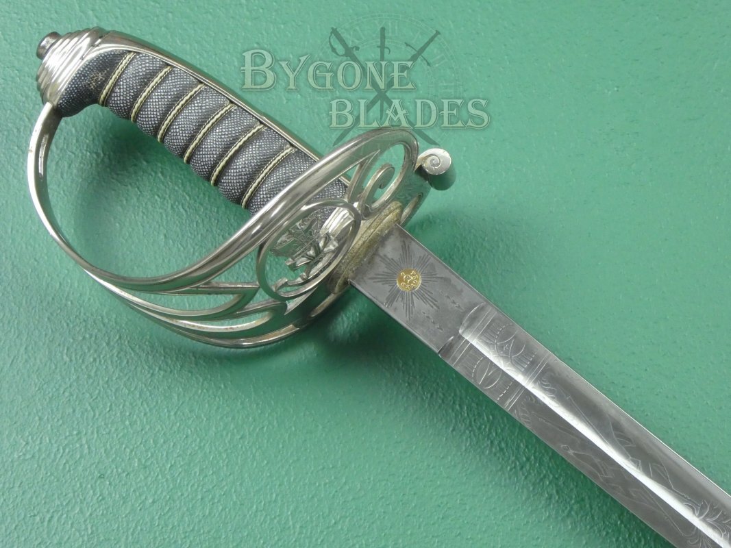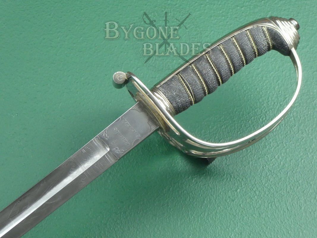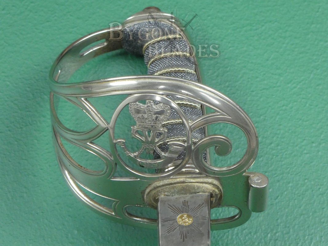 The Gothic steel guard is in very good condition and retains its plating. The guard incorporates an oval cartouche containing the crowned, strung horn badge of the Rifle Regiment. The guard is bright and rust free. The shagreen grip is in excellent condition and the three strands of silver wire are intact and tight. The blade is firm in the hilt.