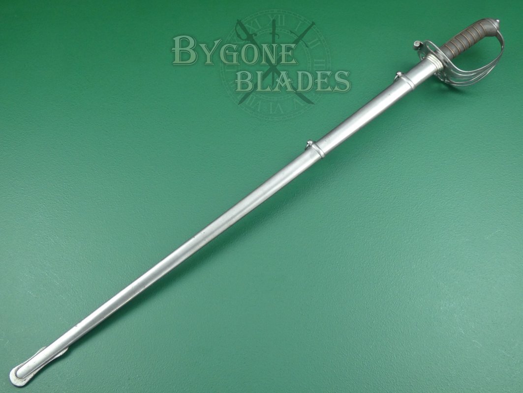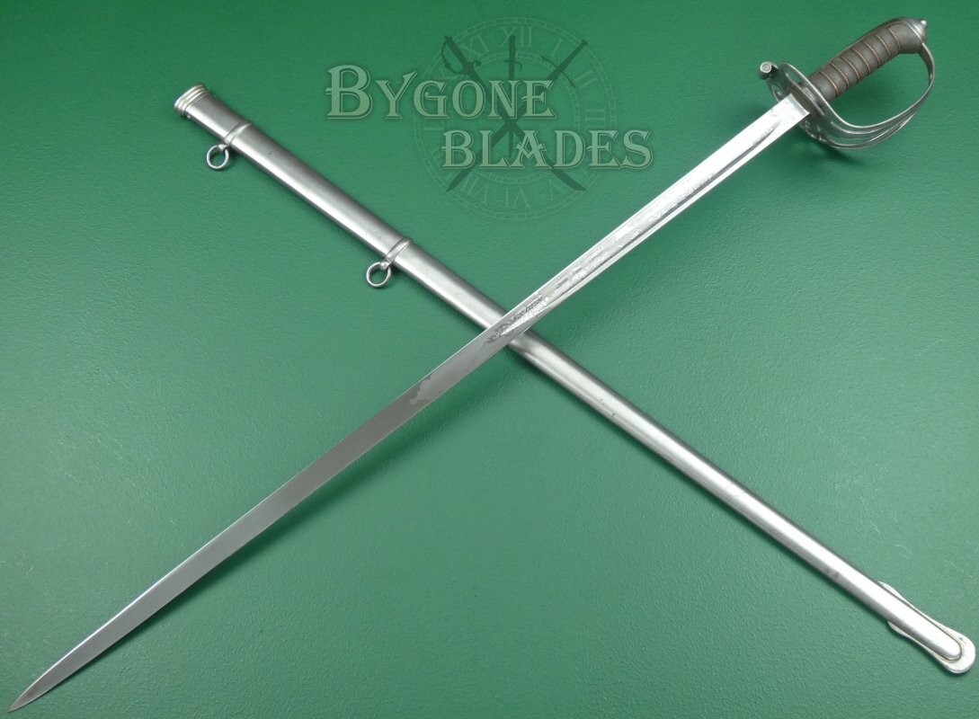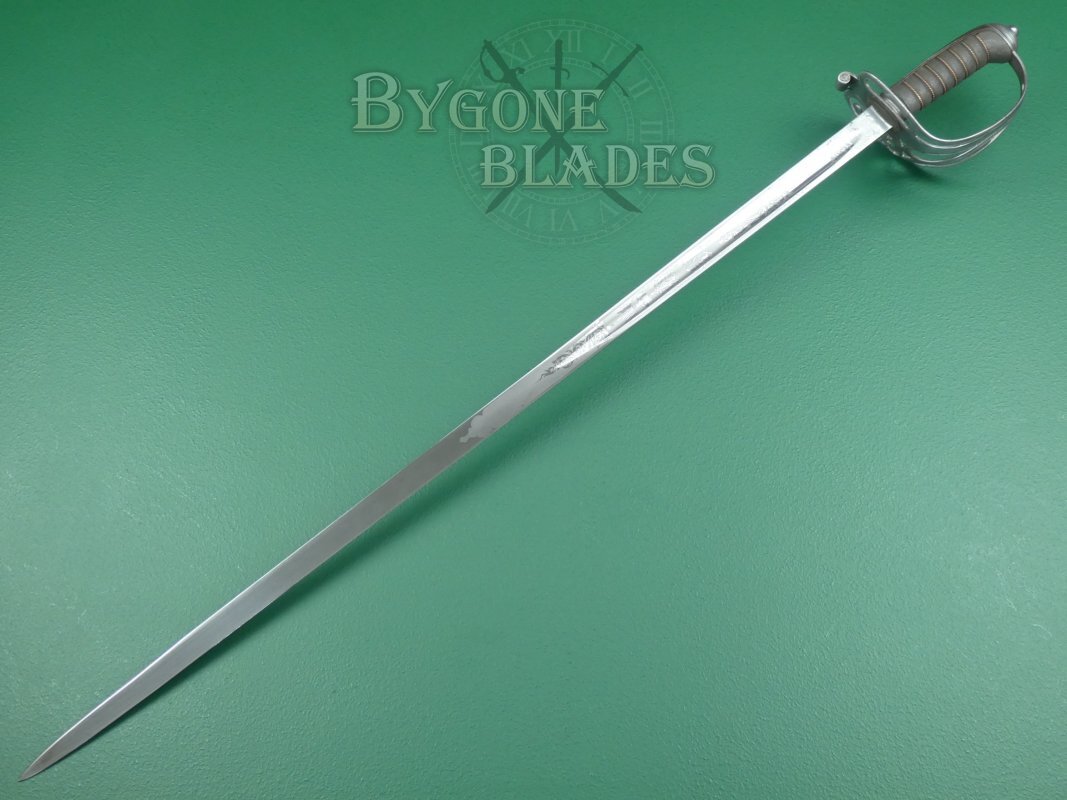 The 840mm single-edged blade is of the 1892 pattern. The blade has a broad central fuller and tapers to a double-edged spear point.