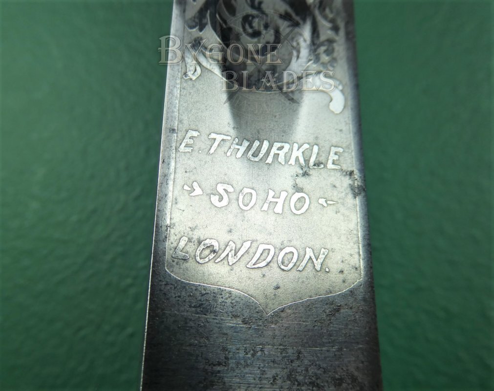 The blade is etched with Queen Victoria’s crowned royal cipher over crossed laurels. Arched panels and foliate scrollwork complete the decoration. The obverse of the blade has the Rifle Brigade’s strung horn below a crowned, black cartouche. The ricasso is etched with the maker’s details, “E. Thurkle. Soho, London.” The obverse ricasso bears Edward Thurkles’ brass proof stud. The blade is in fantastic condition.
