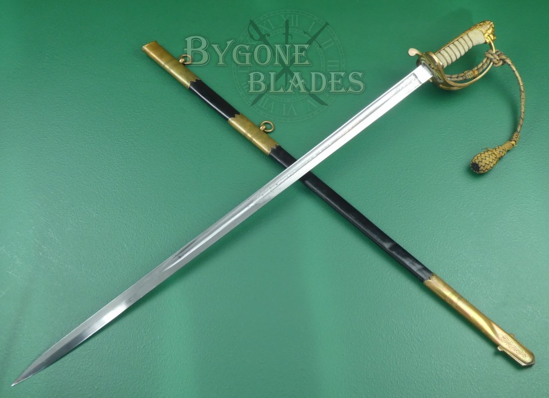 The solid half-basket hilt is in great condition. The bowl of the guard bears the Tudor crown and fouled anchor of the Royal Navy. The inner folding guard is in perfect working order and mates nicely with the pin on the scabbard. The original 1891 pattern commissioned officer's bullion sword knot is in excellent condition.