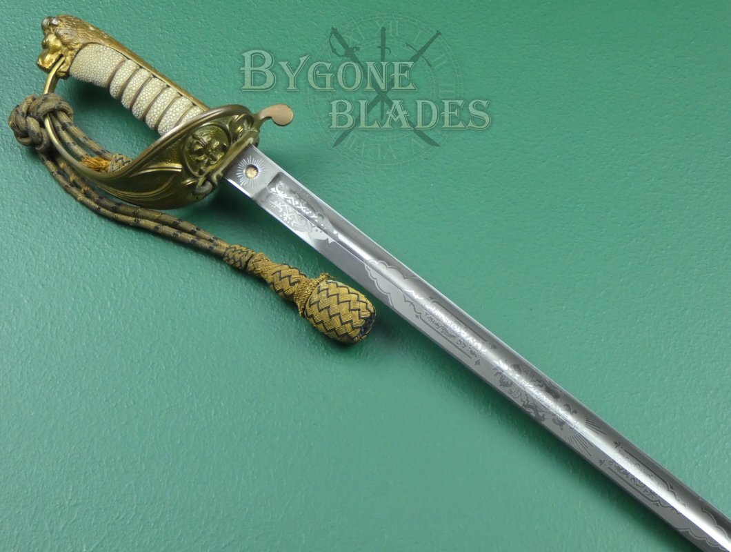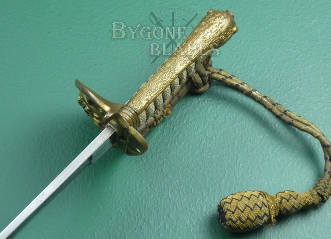 The knuckle bow of the guard is held in the jaws of the lion head and mane of the highly detailed lion head pommel extends for the full length of the back strap. The shagreen grip is of top quality and in great condition. The twisted gilt wire wrap is present and in excellent condition.