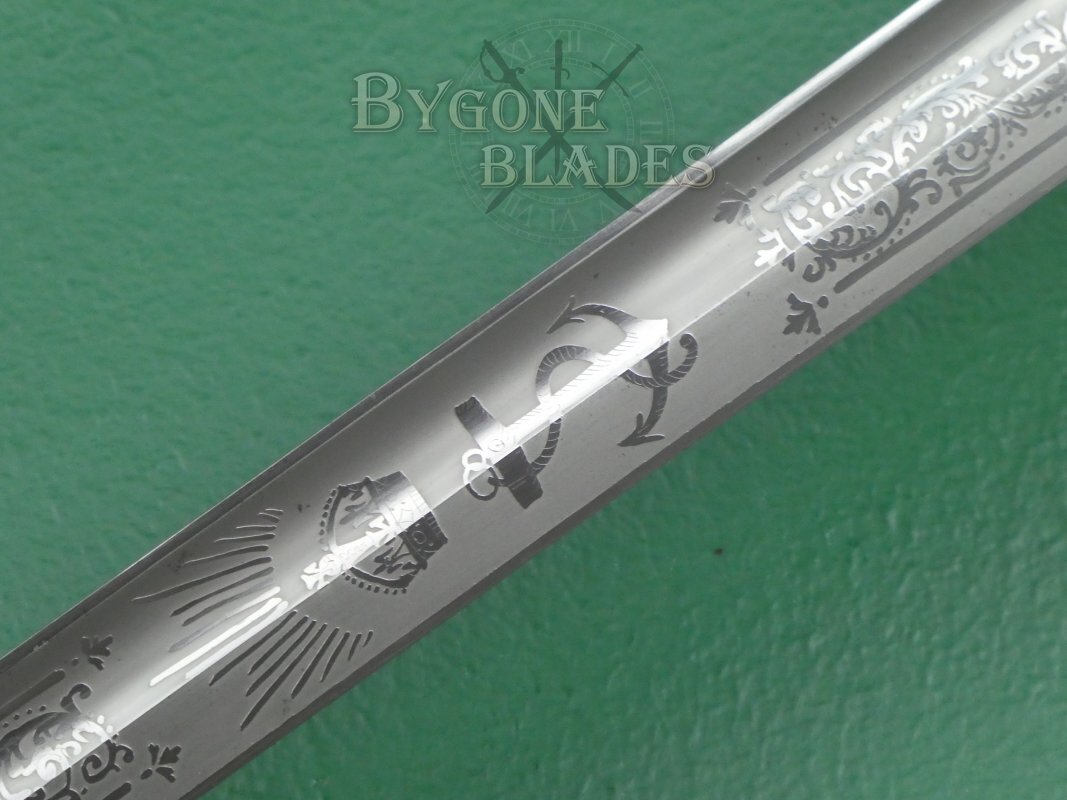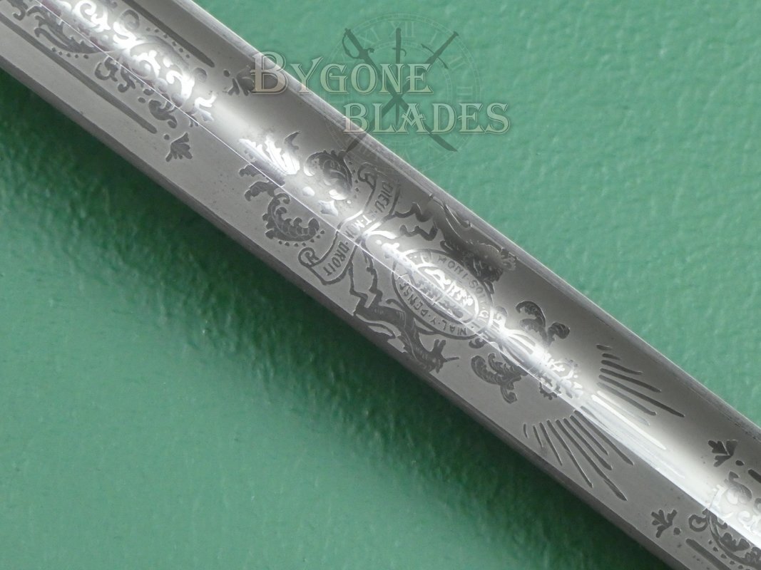 The blade is etched with a Tudor crown and the Royal Navy fouled anchor motif between arches and foliate scrollwork. The obverse of the blade bears the Royal Arms depicting a lion and unicorn rampant and the motto “Dieu et Mon Droit.” The blade is clean and bright and in excellent condition with some small, isolated spots of tarnish.
