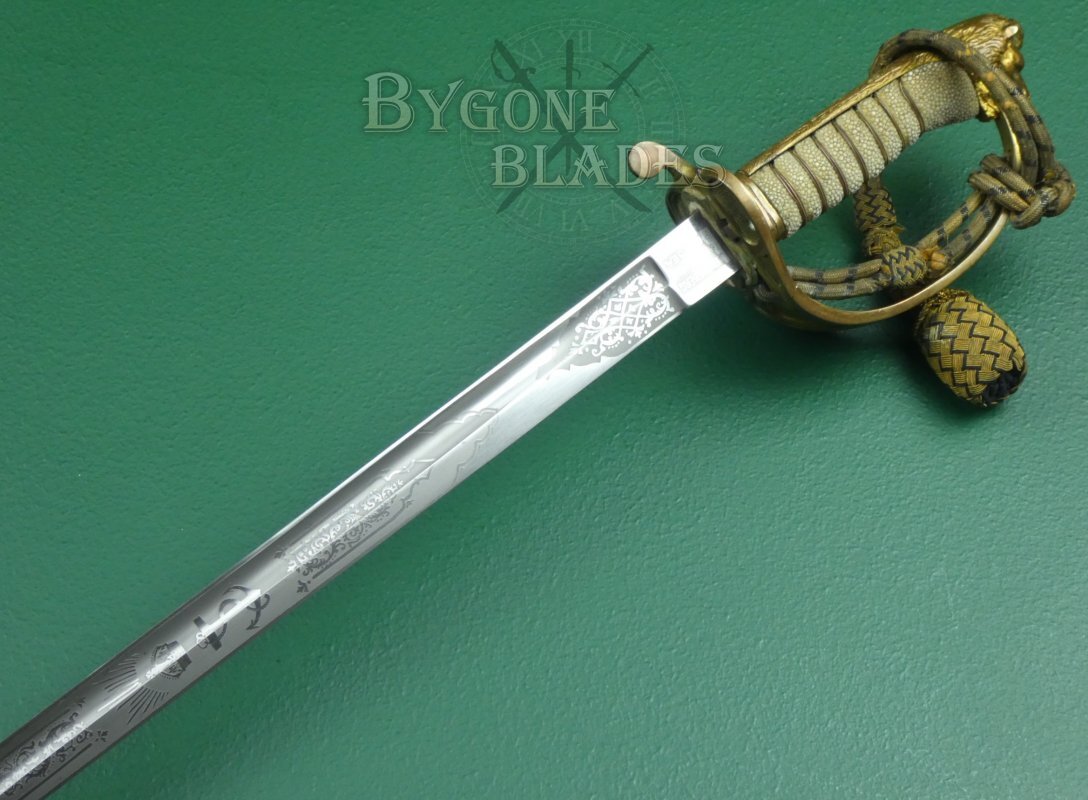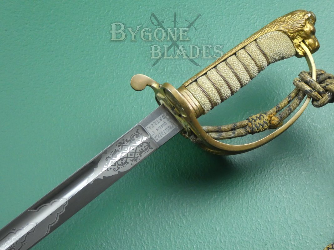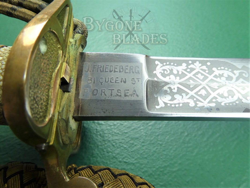This British 1827/46 pattern Victorian Royal Navy officer’s sword was made in the last quarter of the 19th Century and retailed by J Friedeberg who traded from his premises at 81, Queen Street, Portsea from 1863. The sword is complete with its 1891 pattern bullion knot.