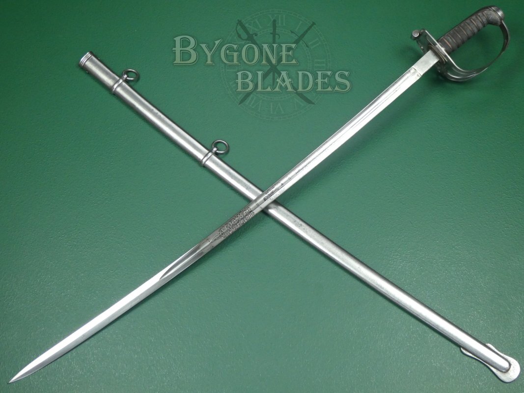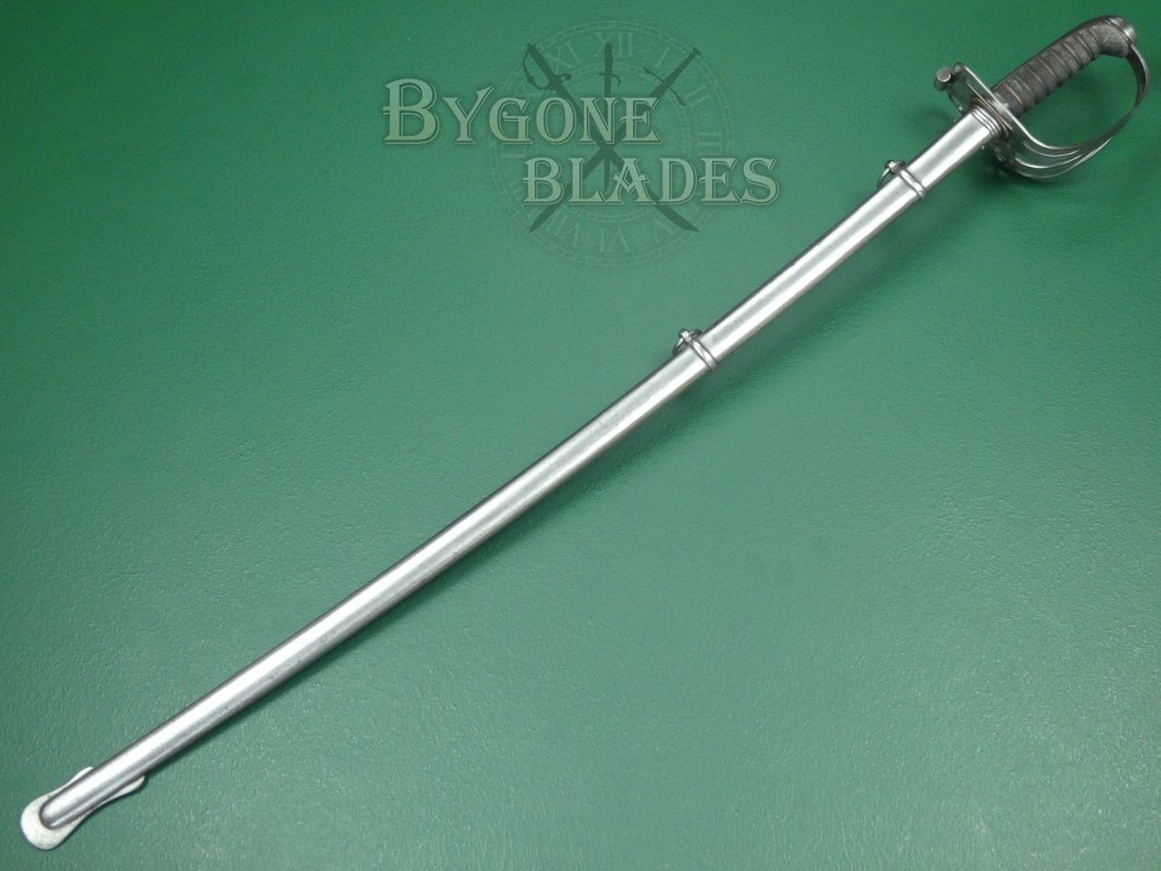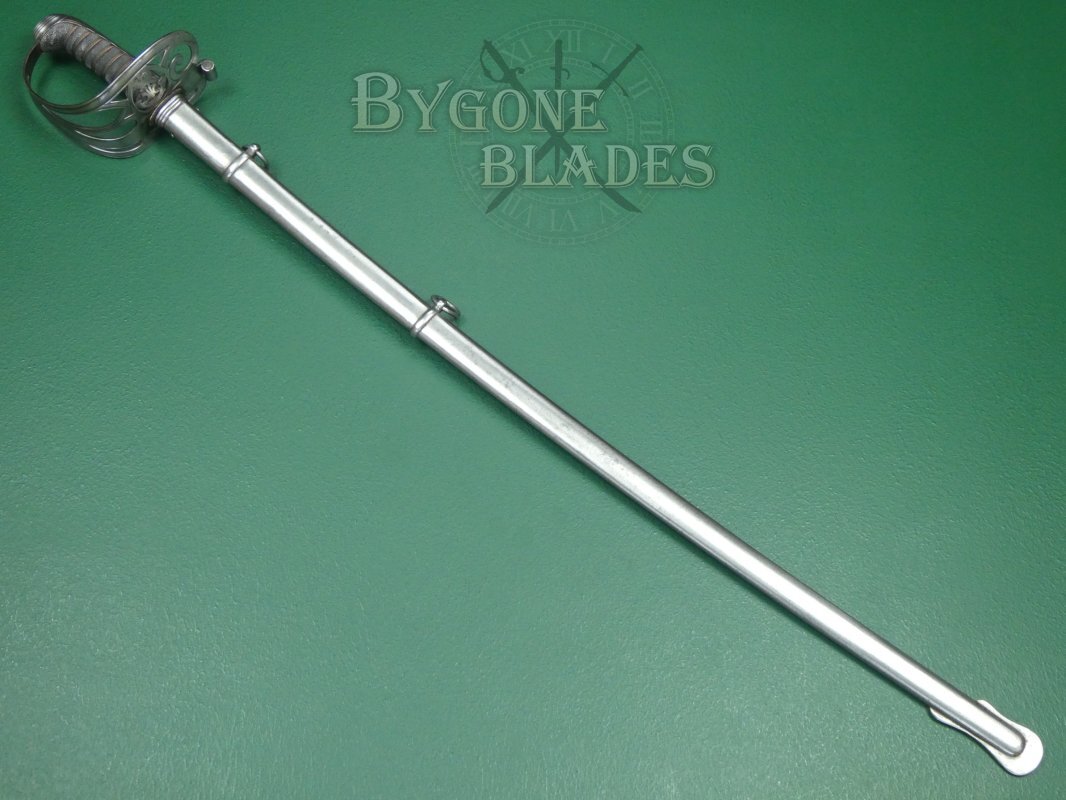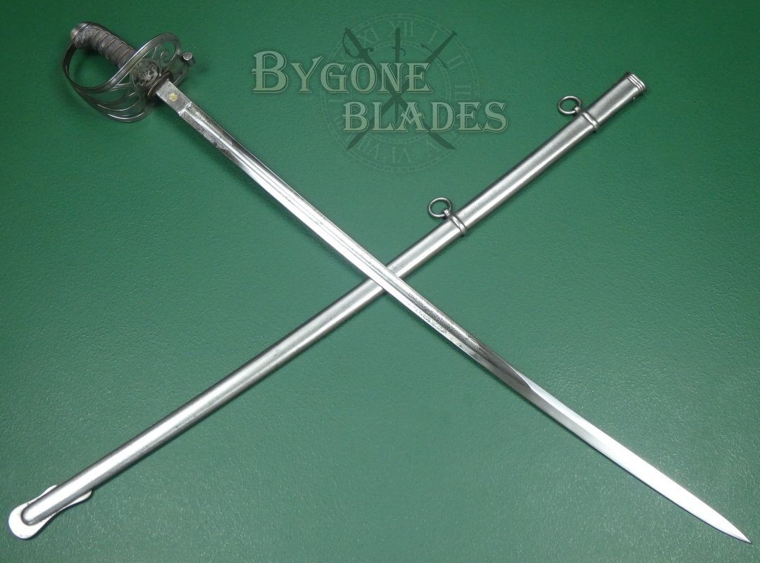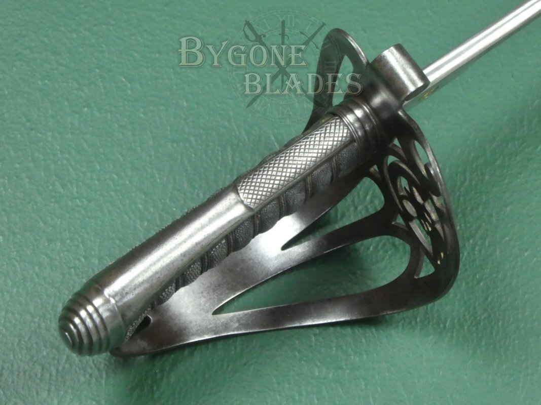 The sword is complete with its polished steel scabbard with two suspension rings. The scabbard is in good condition with a speckled patina. The sword sheathes and draws smoothly.