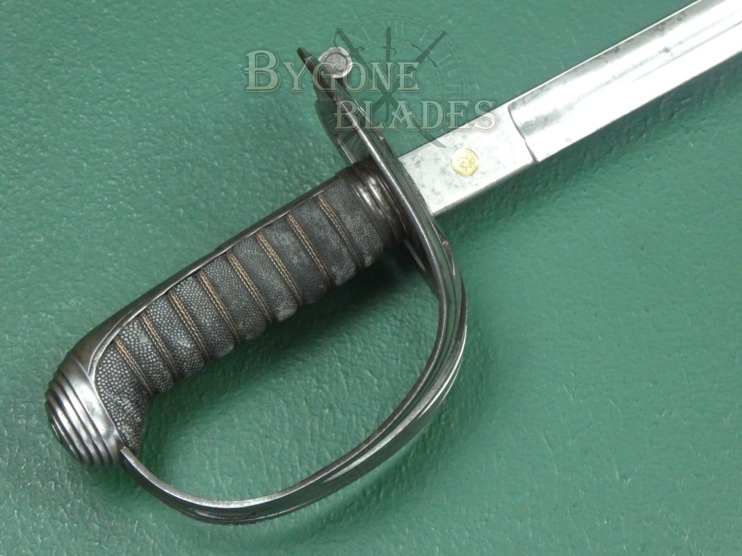 The Gothic steel guard is in good condition with minor wear. The guard incorporates an oval cartouche containing the crowned, strung horn badge of the Rifle Regiment. The smooth back strap has a knurled thumb rest and ends in a stepped oval pommel. The shagreen grip is in good condition with some polish residue that can be cleaned off. The three strands of wire are intact and tight. The blade is firm in the hilt.