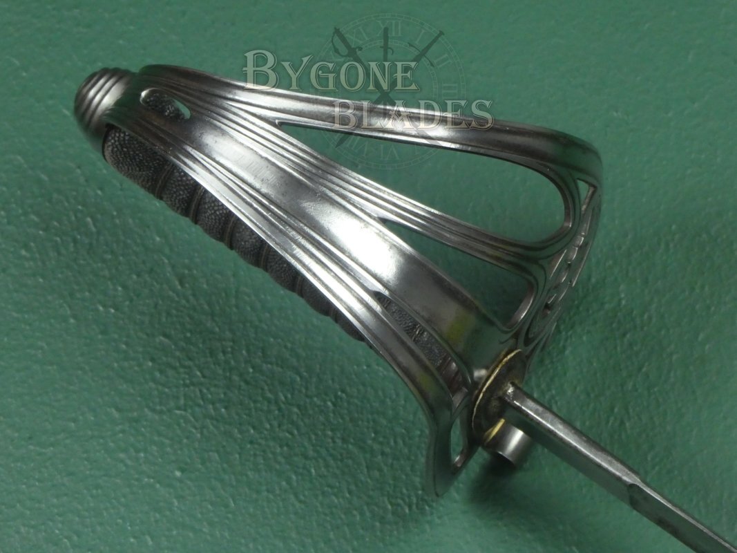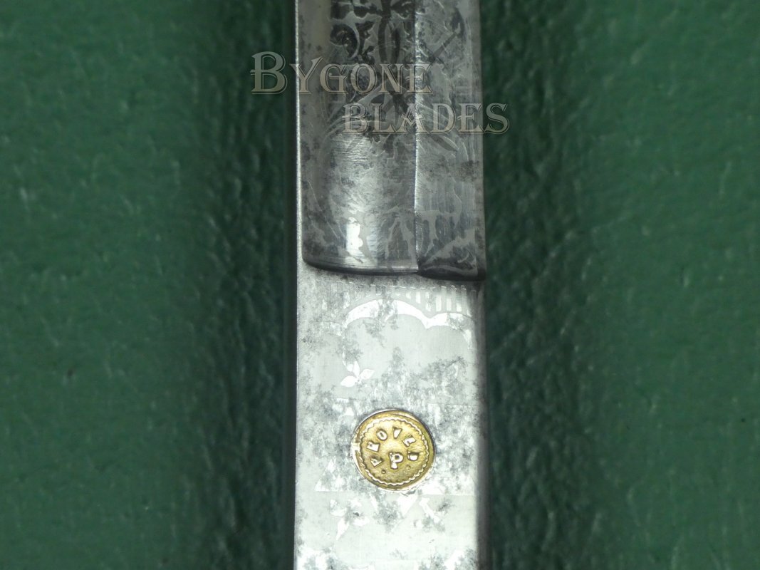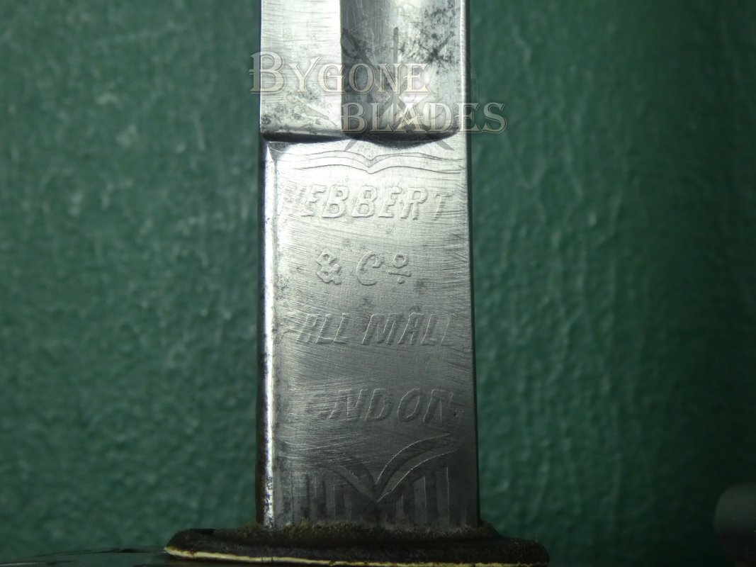 The blade is etched with the Rifle Brigade’s strung horn with the words, Volunteer Rifles. The obverse of the blade has Queen Victoria’s crowned royal cipher amidst foliate scrollwork panels. The ricasso is etched with the retailer’s details, Hebbert & Co., Pall Mall, London. Hebbert & Co. traded from these premises until 1864. The obverse ricasso bears a proof stud showing the letter P.