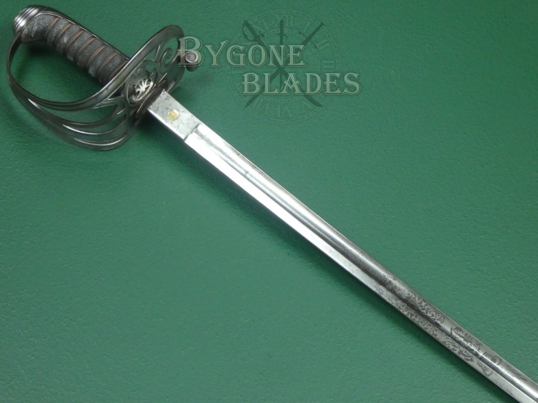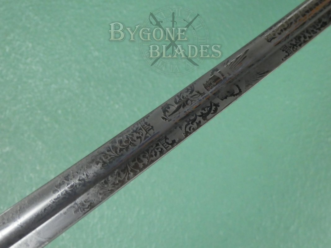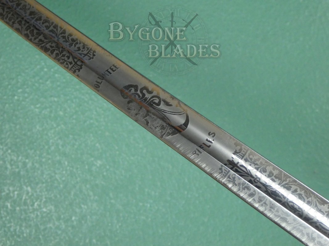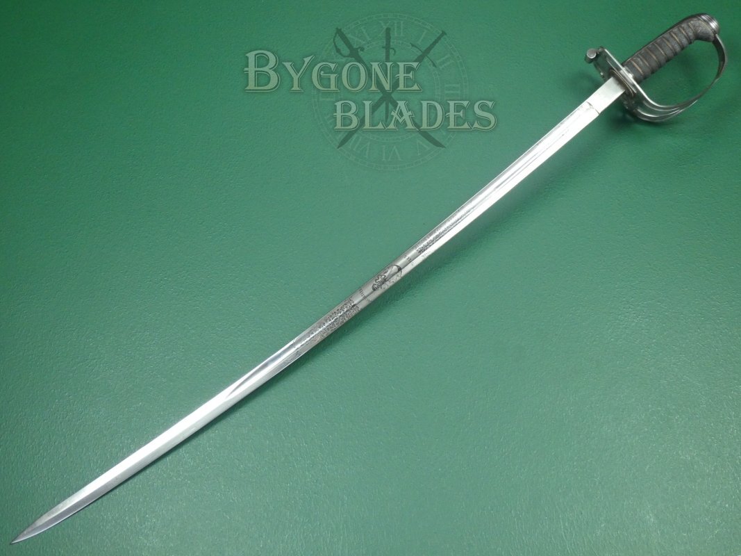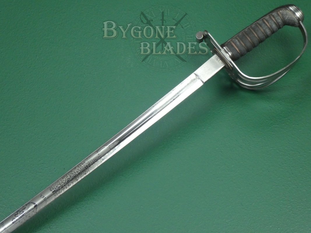 The 820mm single-edged blade is of the 1845 “Wilkinson” pattern. Earlier 1845 pattern blades were slightly curved, becoming straighter as the 19th Century entered its final quarter. The blade has a flat spine above a broad single fuller and tapers to a double-edged spear point. The blade is in good condition with small patches of pale tarnish and some wear to the etching. There are sharpening scratches along its length on one side.