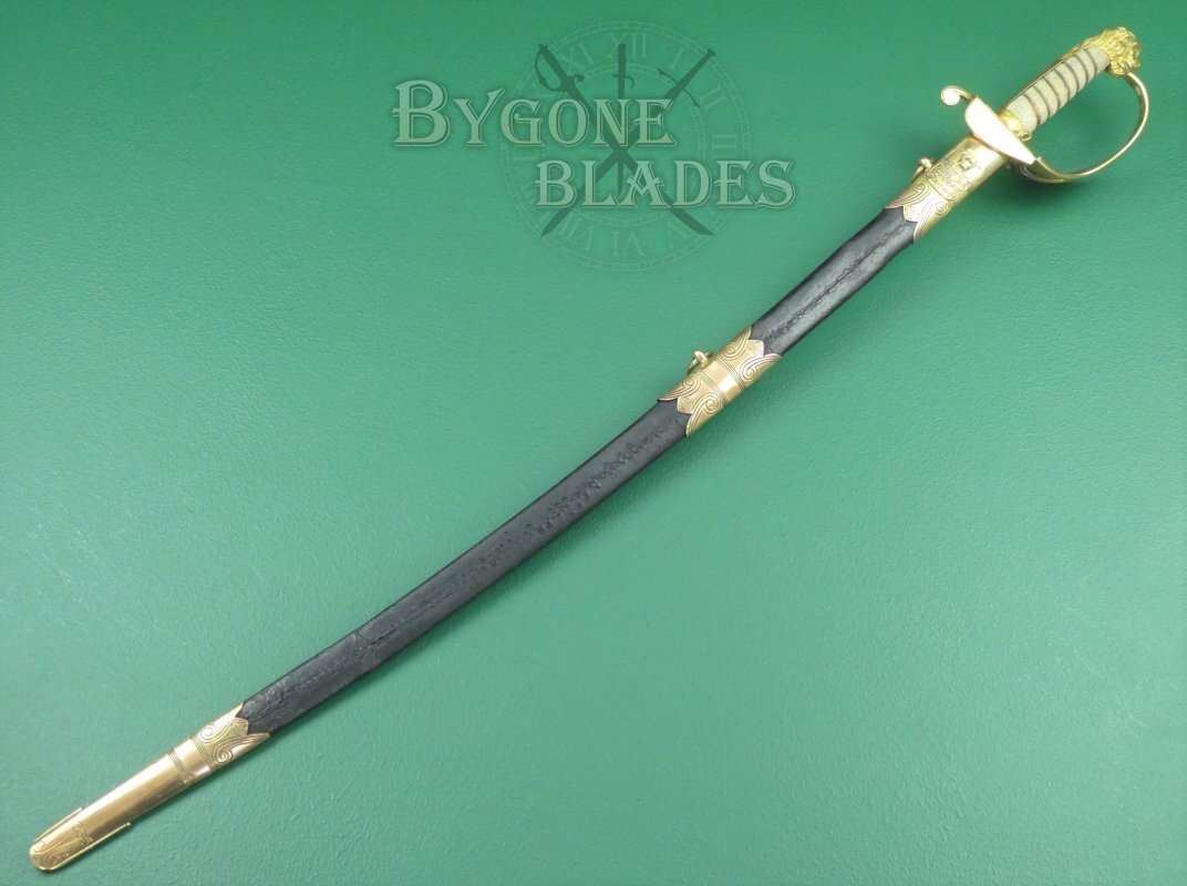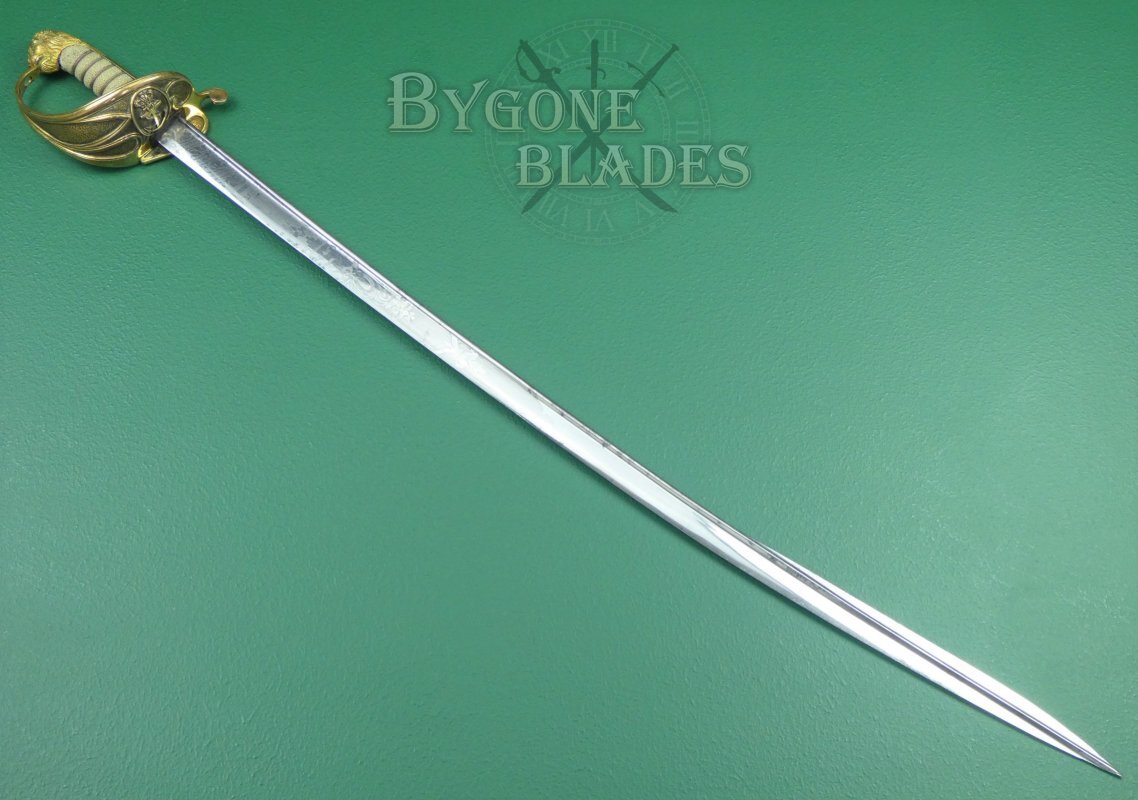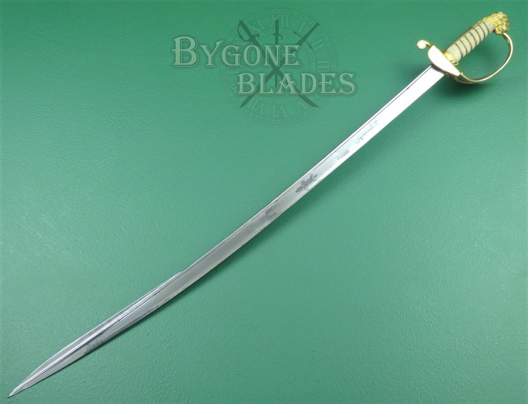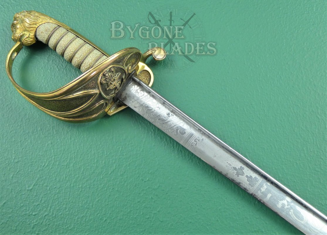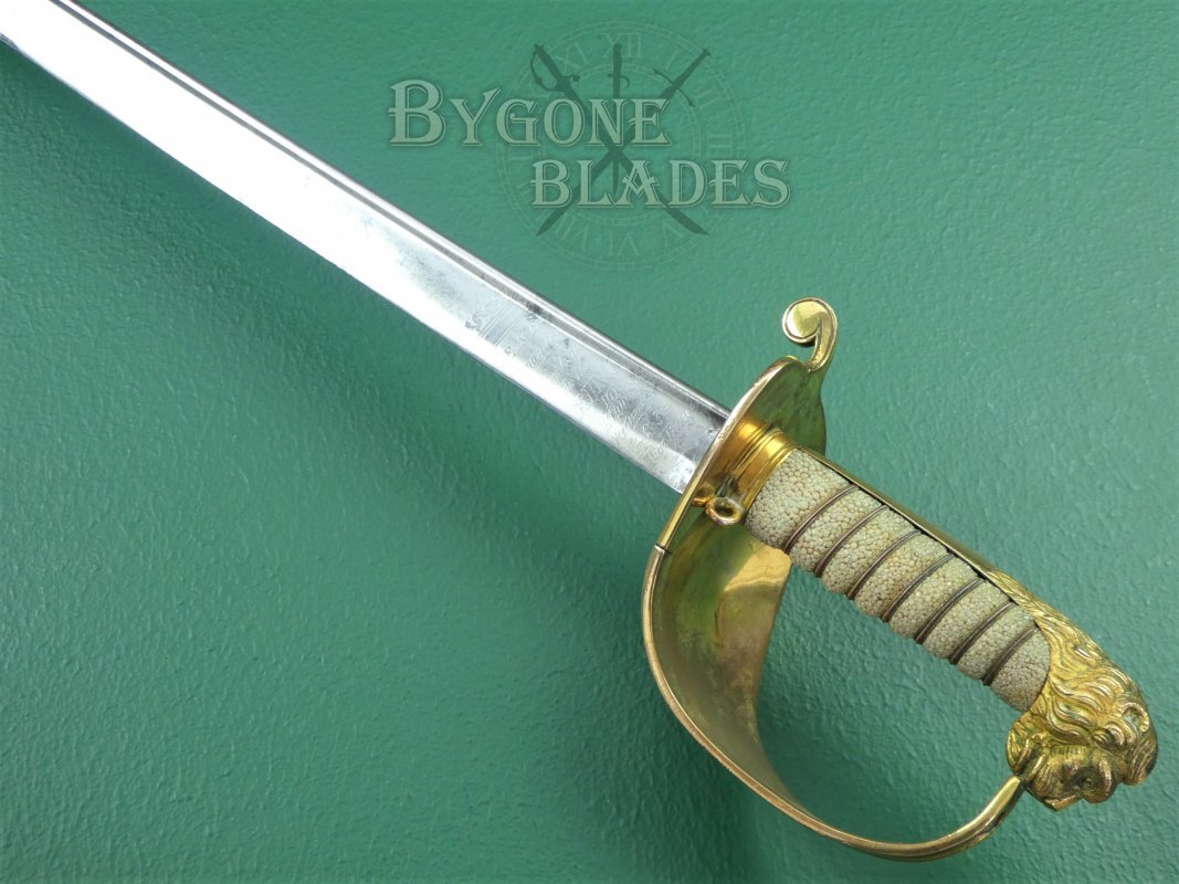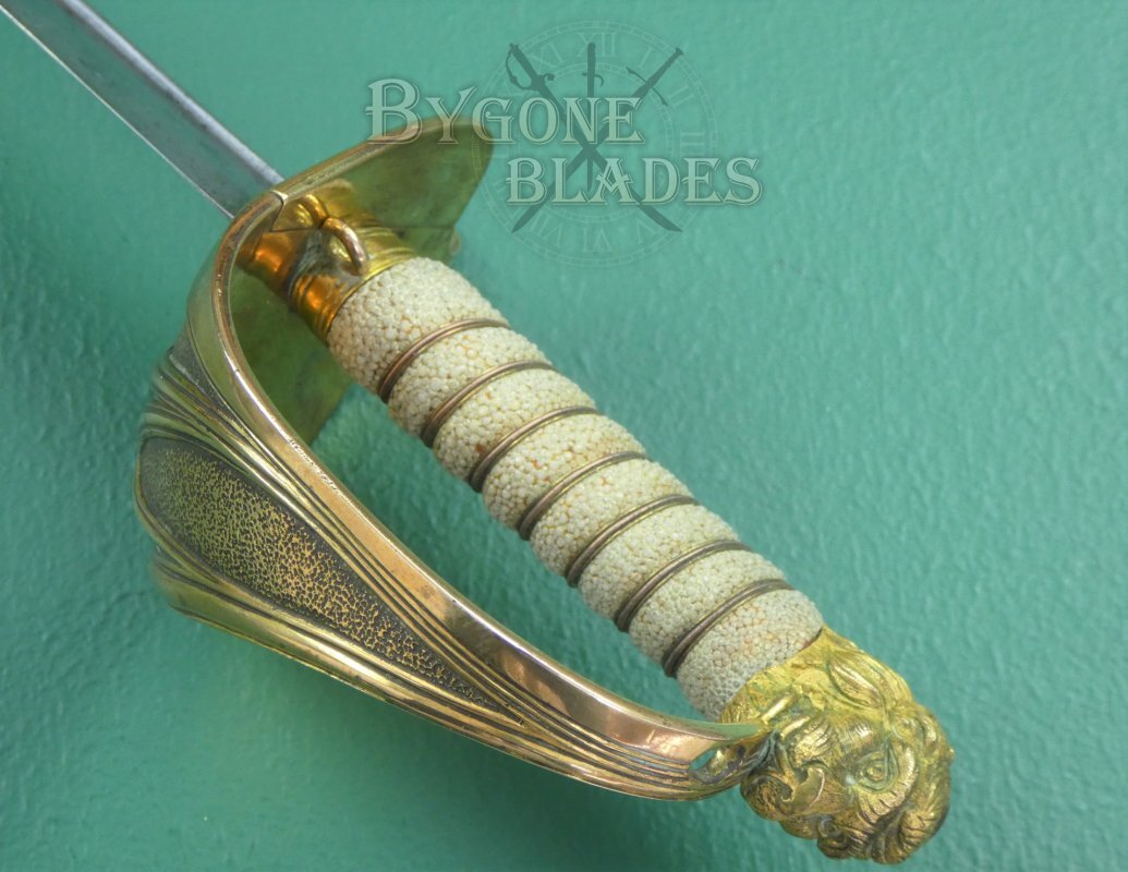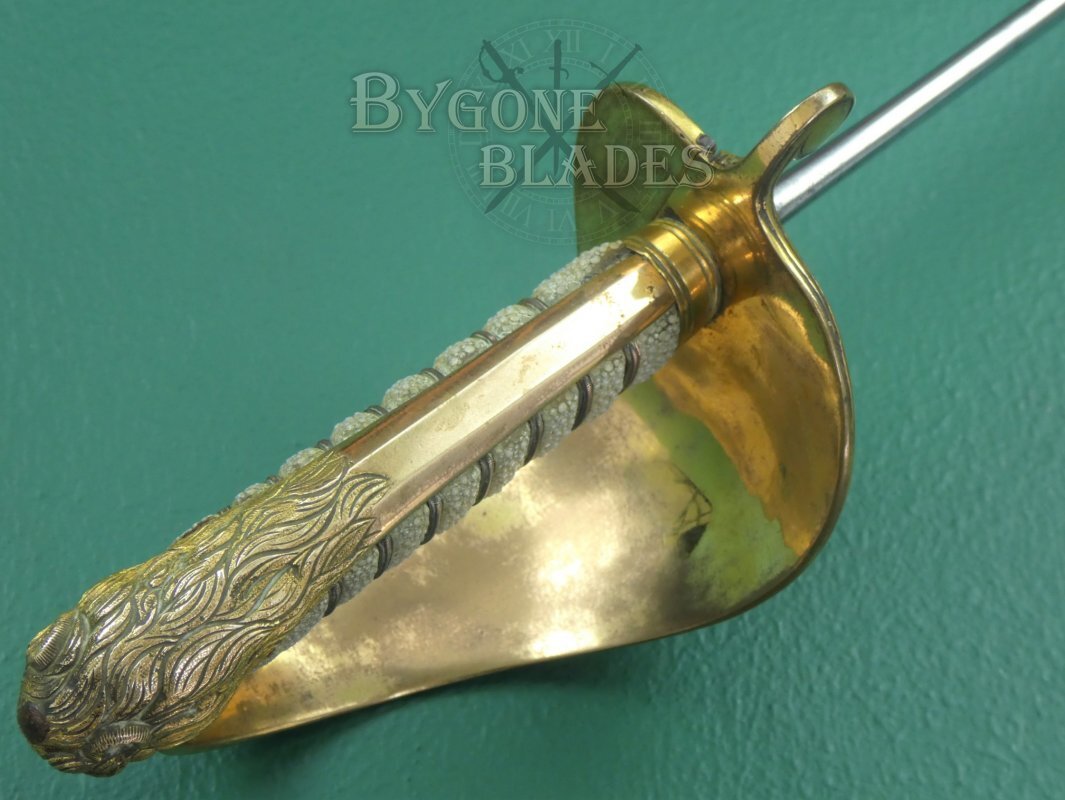 The 1827 pattern, solid half-basket hilt is made of gilt brass and remains in excellent condition. The inner folding guard is in perfect working order and the hinge is firm and strong. The mane of the highly detailed lion head ends just below the pommel. The back strap is faceted and the “D” guard extends from between the lion’s jaws. The grip collar has an integral ring through which the sword knot was threaded. The white shagreen grip is of the highest quality and in excellent condition. The three strands of twisted wire are present and tight. The blade is firm in the hilt.