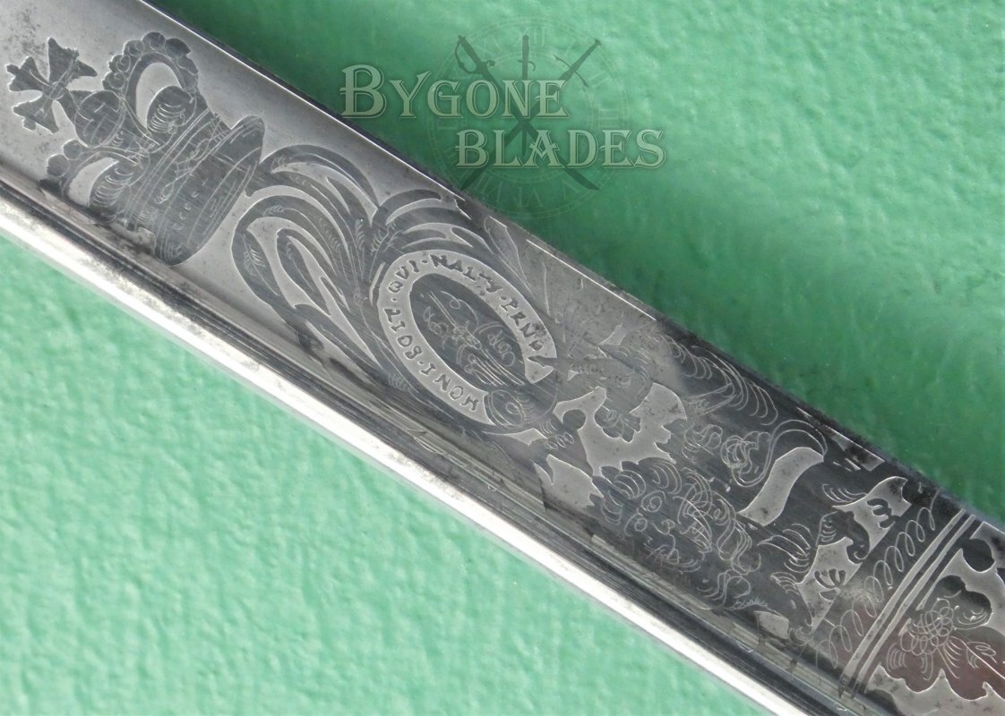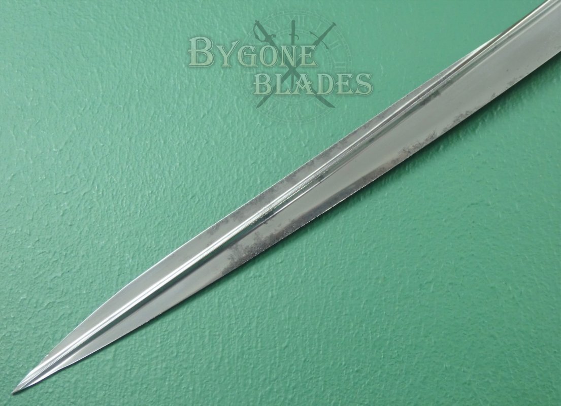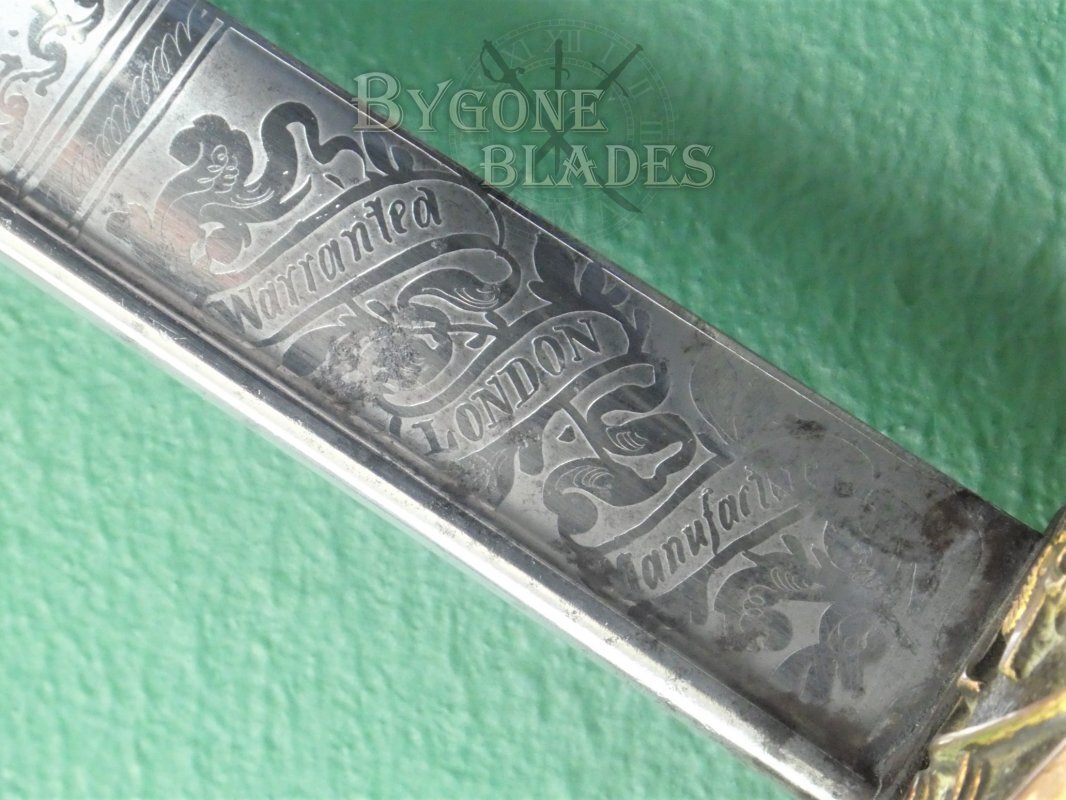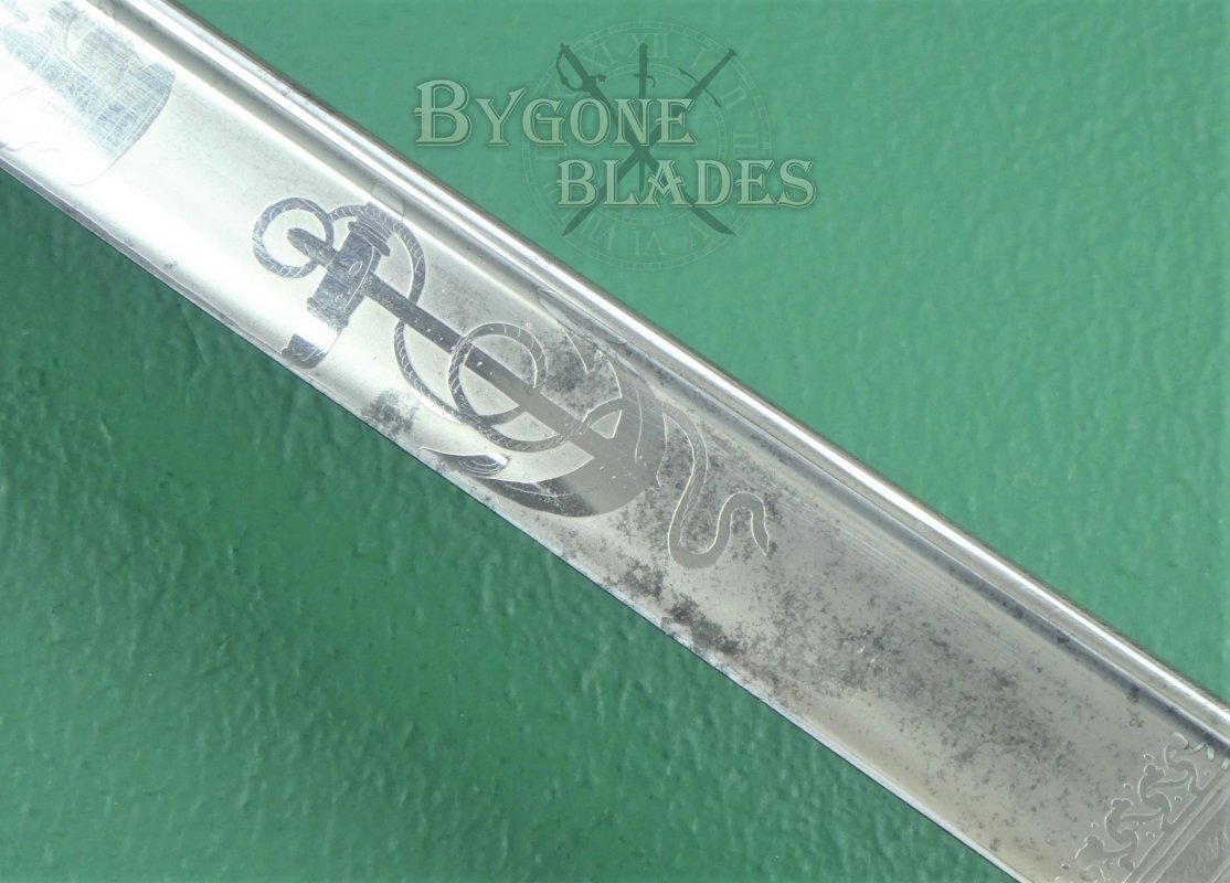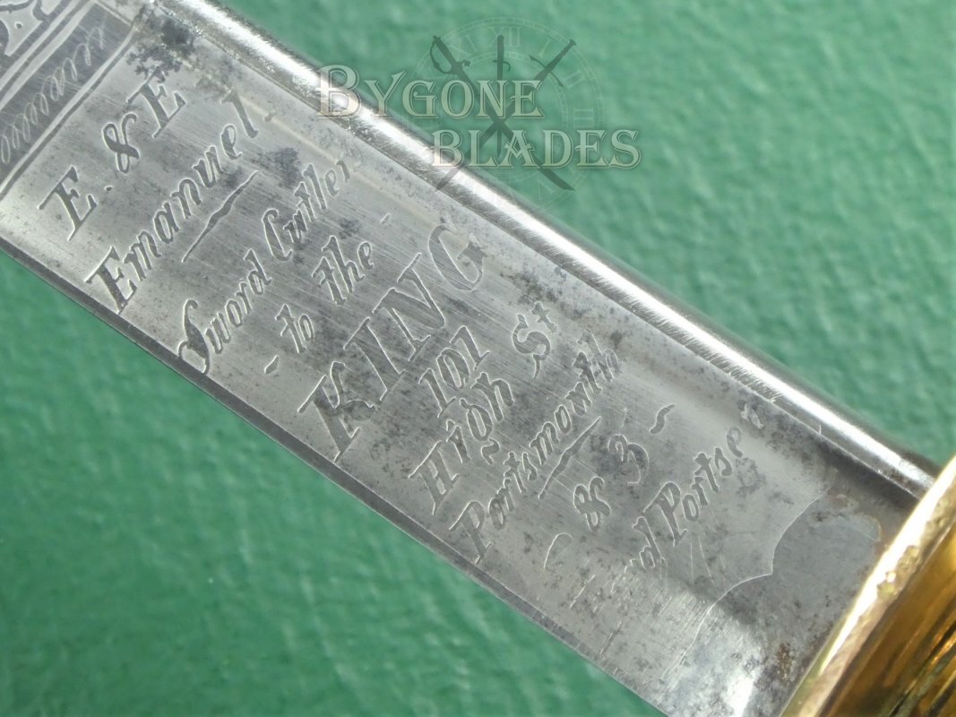 The blade is in fantastic condition and retains its full etching and original polish. There are some small patches of pale tarnish along the spine and towards the quill point. The blade is beautifully etched with the crowned Royal Arms and the forte bears a ribboned banner containing the words “Warranted London Manufacture.” The obverse bears a crown above the Royal Navy fouled anchor. The forte is etched with the cutler’s details, “E. & E. Emanuel Sword cutlers to the King. 101, High St Portsmouth & 3, Hard Portsea.”