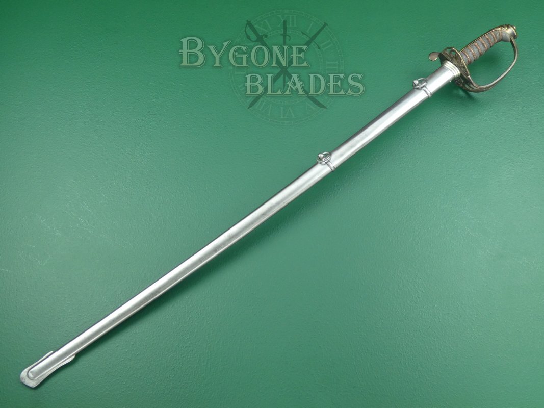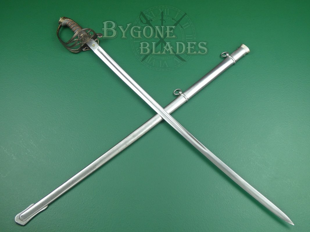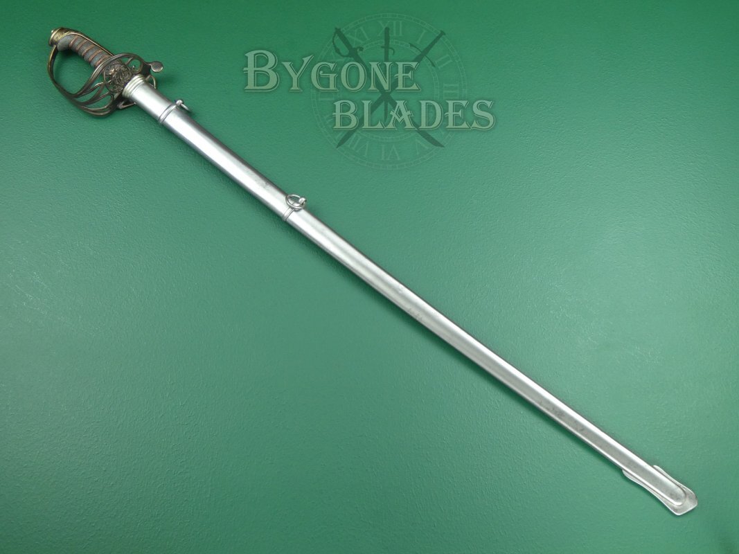 The sword is complete with its polished steel scabbard with two suspension rings. The scabbard is in very good condition. The sword sheathes and draws smoothly and is held firmly within the scabbard.