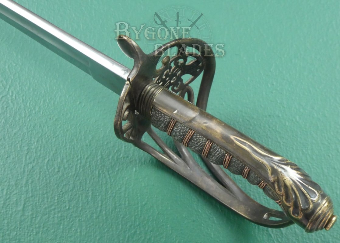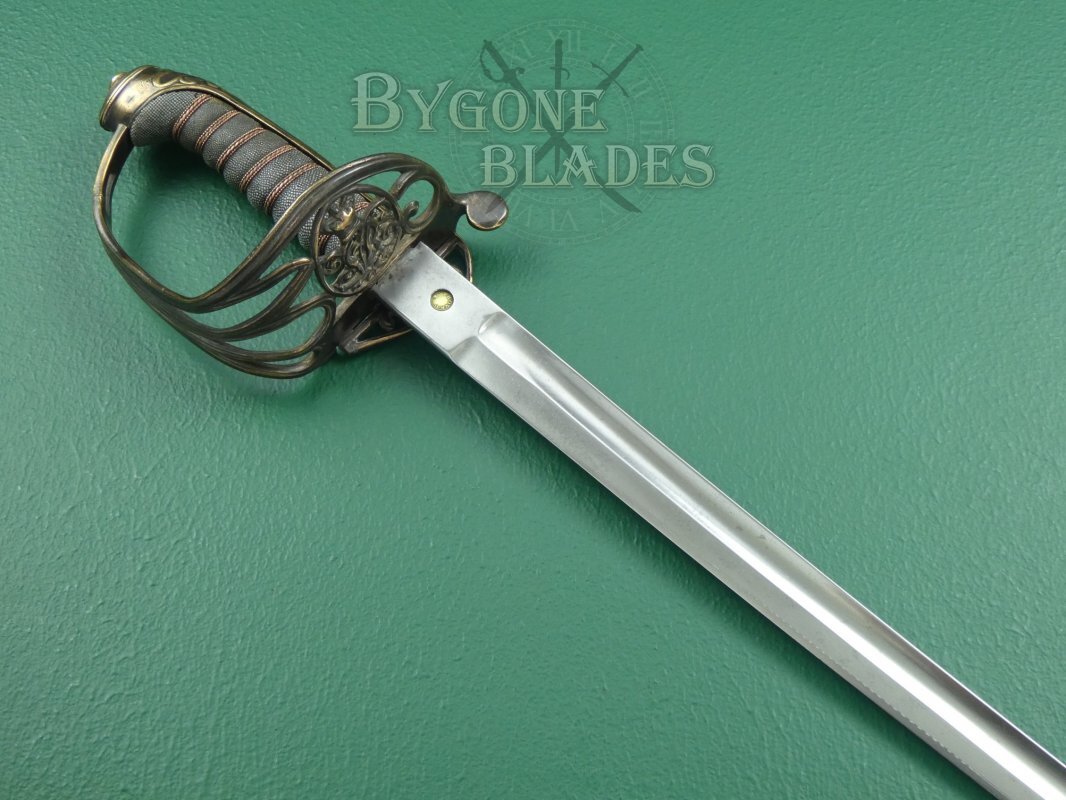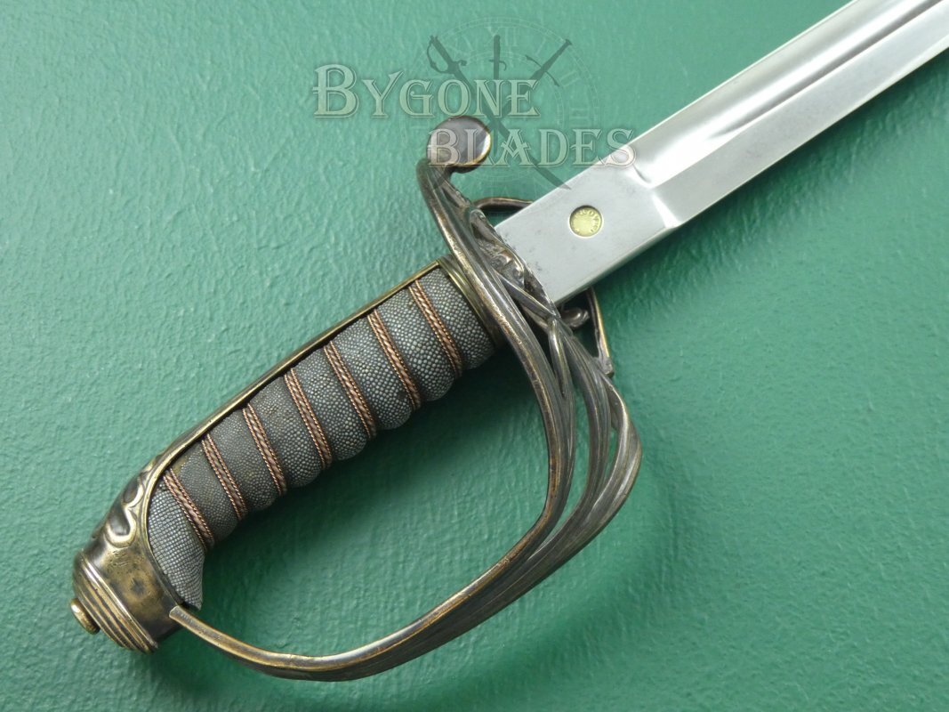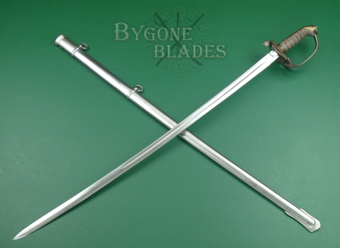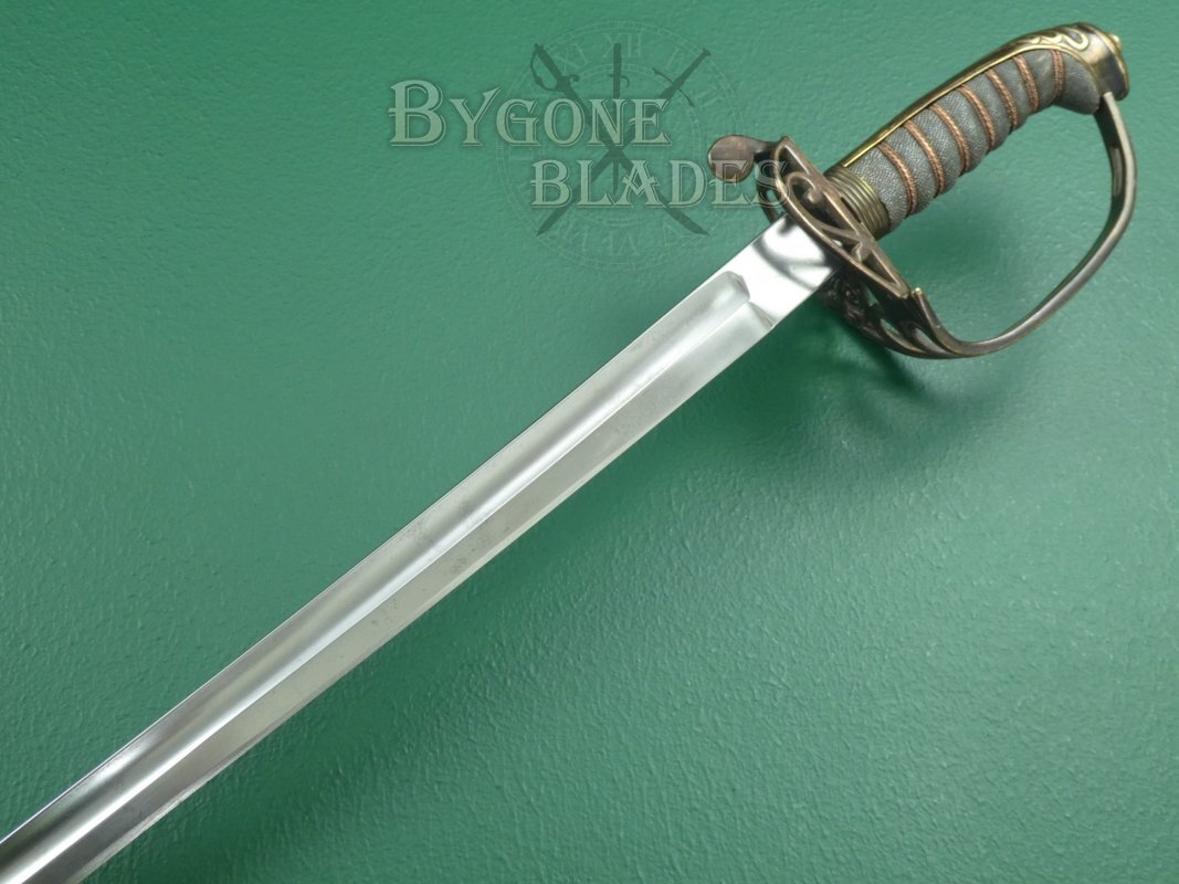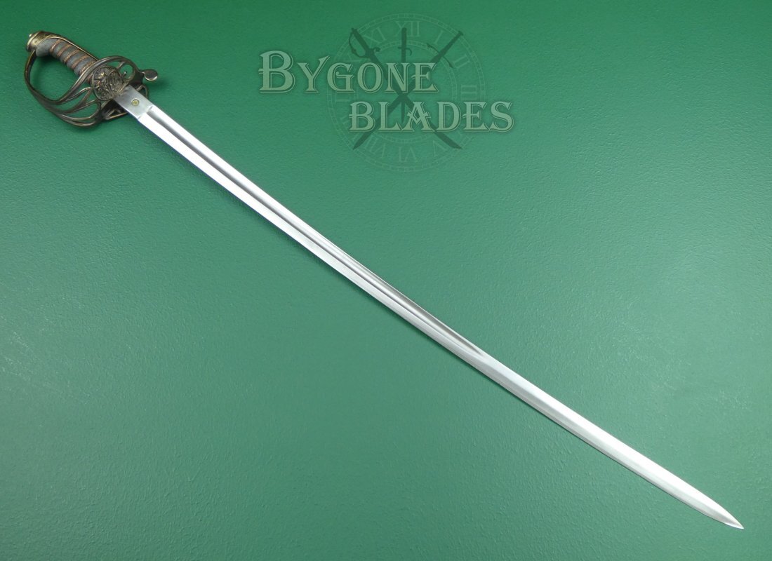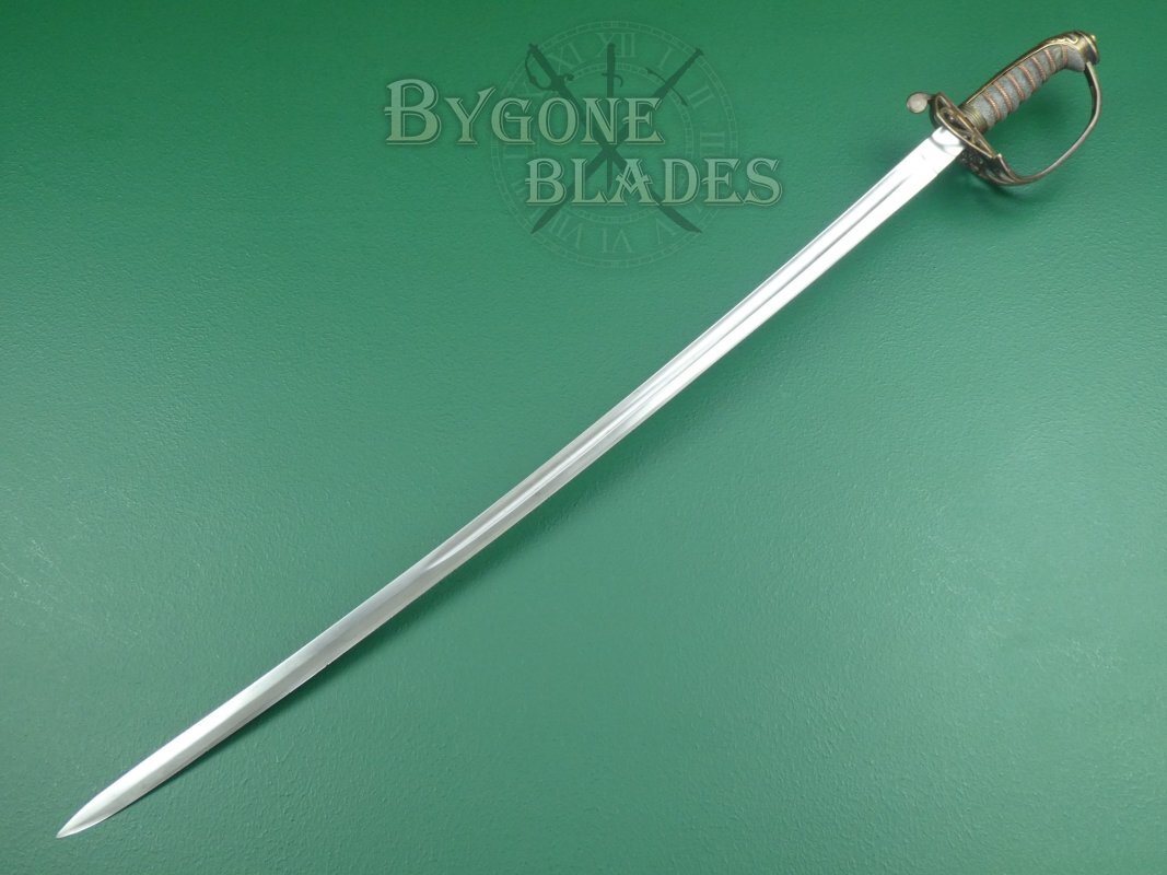 This is a scarce British 1845 pattern infantry officer’s fighting sword. The sword dates to between 1845 and 1852 and was made by George Alfred Pillin. Typical 1845 pattern officer's swords are relatively common. Un-etched fighting swords are not. Given the manufacturing date, it is likely that this sword was made in preparation for deployment to the Crimea.