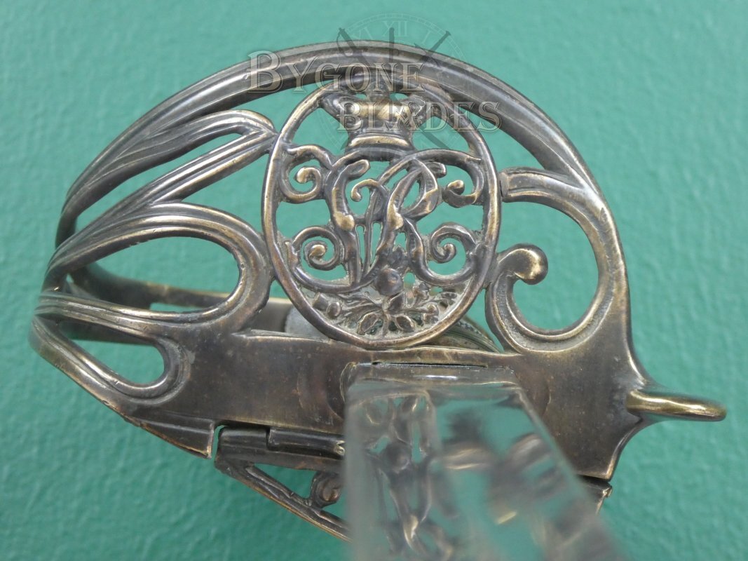 The barred, gothic guard is the folding 1822 regulation pattern. The guard bears the Royal cypher of Queen Victoria above the Flowers of Union – the rose, thistle and shamrock and is in reasonable condition. There is some slight distortion to the first of the bars and to the base of the knuckle bow but it is almost unnoticeable. The action of the folding section is no longer crisp and there is some looseness in the open position.