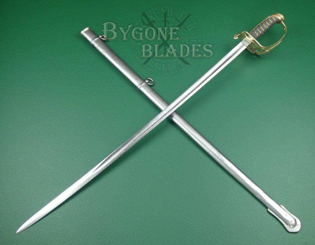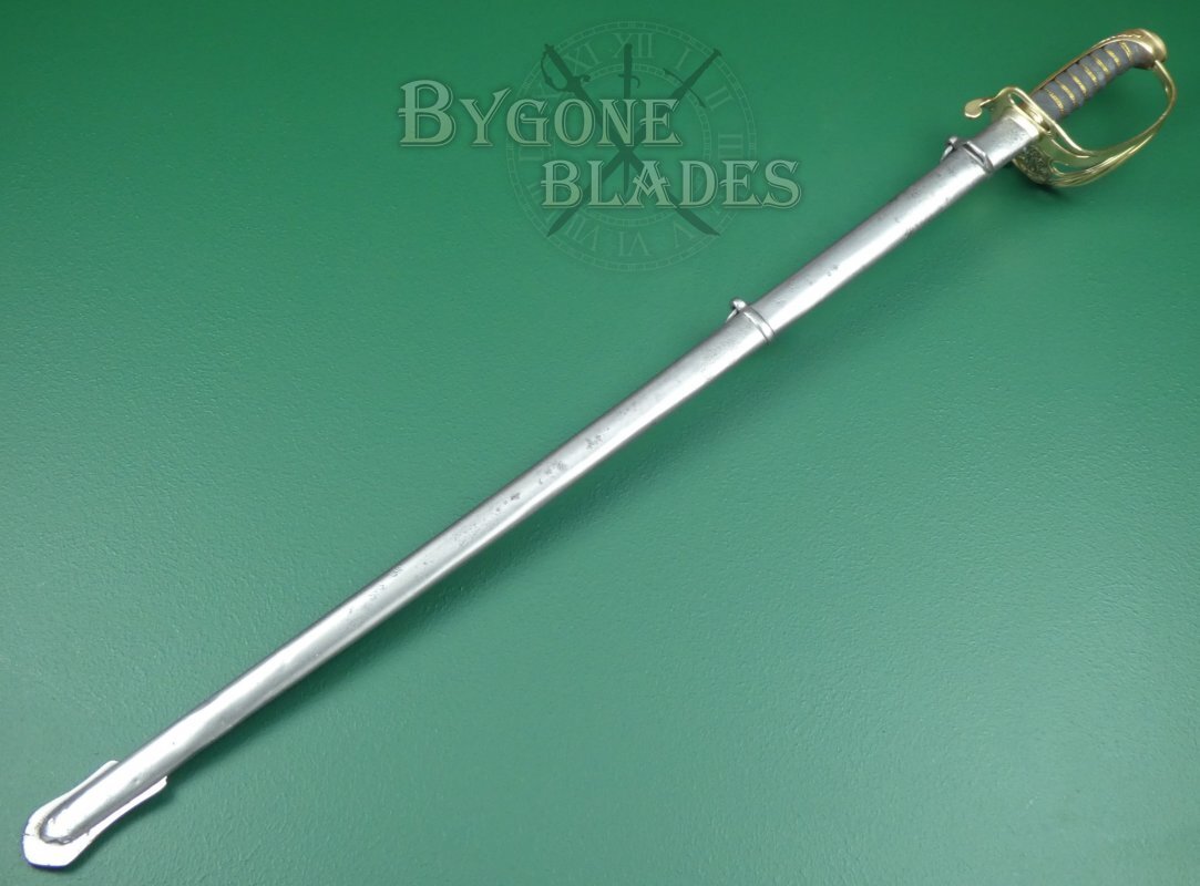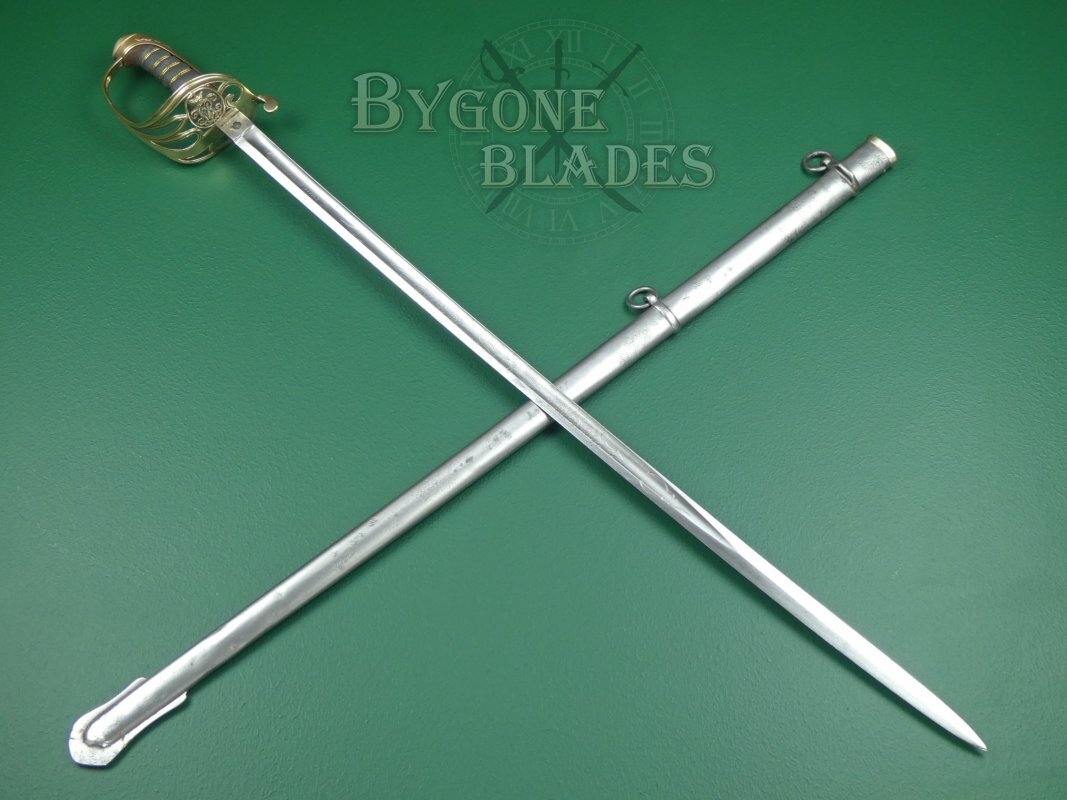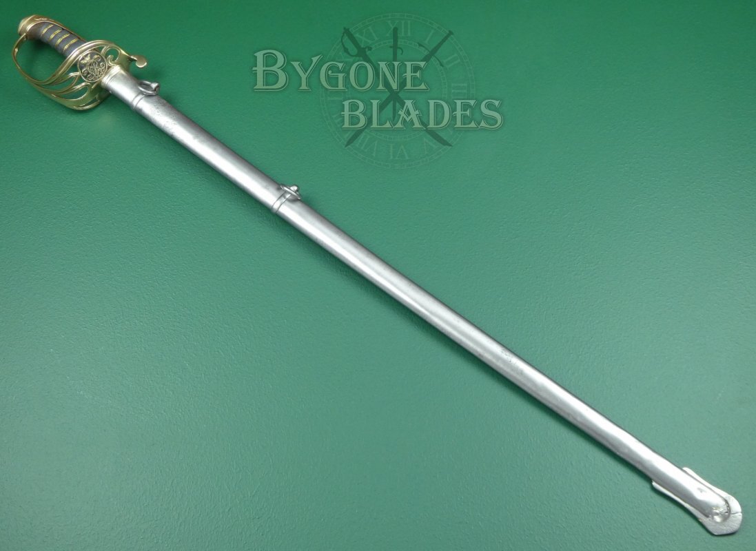 This British 1845/54 pattern infantry officer’s sword was made by the Wilkinson Sword Company in 1869. The sword was owned by Major Wigram Montagu Money of the Gloucestershire Regiment.