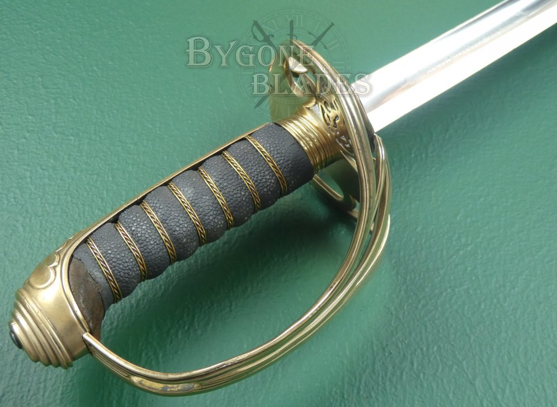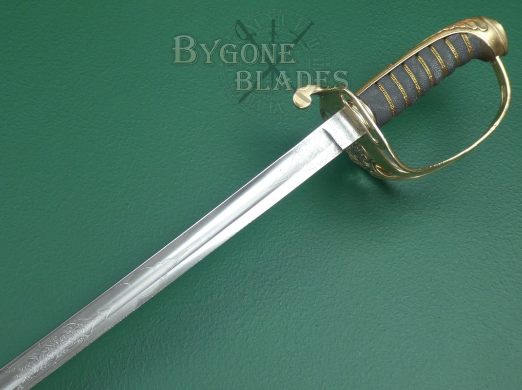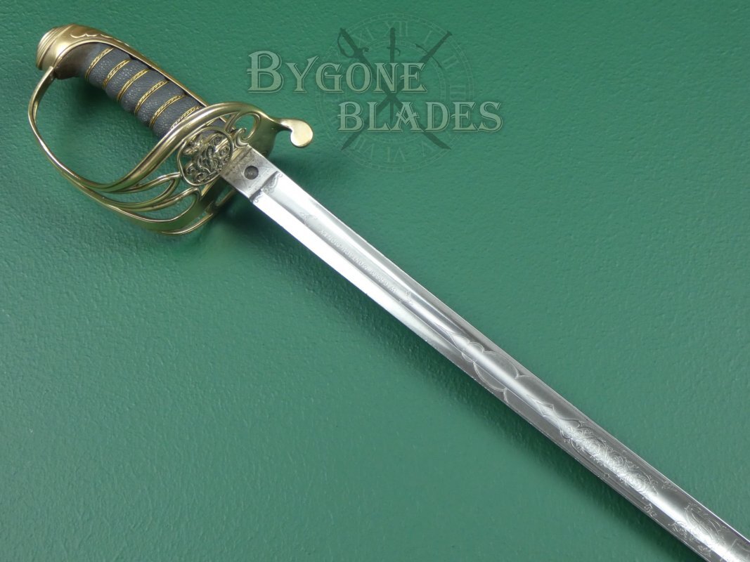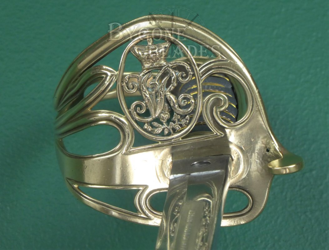 The barred, gothic guard is the fixed, 1854 regulation pattern without the earlier folding section. The guard bears the Royal cypher of Queen Victoria above the Flowers of Union – the rose, thistle and shamrock and is in good condition. The ray skin covering on the grip has been replaced and is in good condition with some loss to the shagreen below the pommel. The three strands of brass wire are intact and tight. The hilt’s back strap has acanthus style decoration flowing into the stepped pommel. The blade is firm in the hilt.