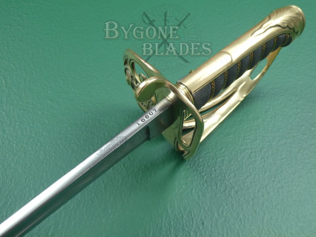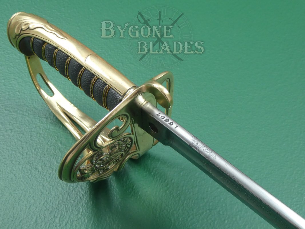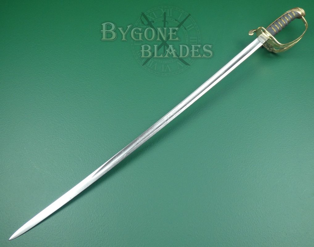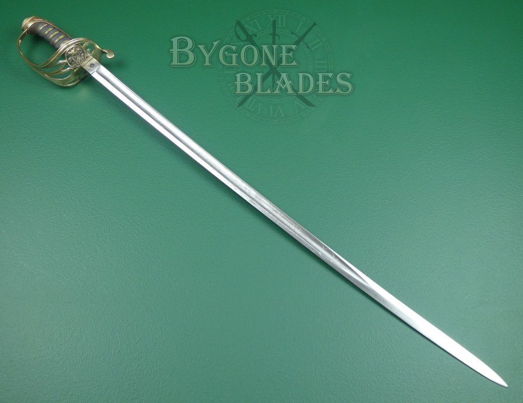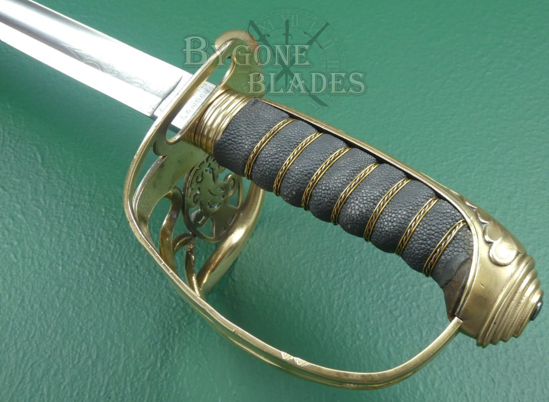 The barred, gothic guard is the fixed, 1854 regulation pattern without the earlier folding section. The guard bears the Royal cypher of Queen Victoria above the Flowers of Union – the rose, thistle and shamrock and is in good condition. The ray skin covering on the grip has been replaced and is in good condition with some loss to the shagreen below the pommel. The three strands of brass wire are intact and tight. The hilt’s back strap has acanthus style decoration flowing into the stepped pommel. The blade is firm in the hilt.