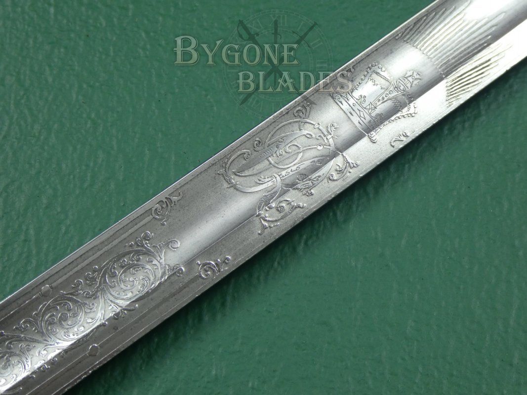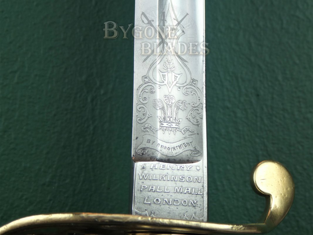 The blade is in excellent condition and is deeply etched with foliate panels above the crowned cypher of Queen Victoria. The forte is etched with the owner’s name, “Wigram Montagu Money.” The obverse of the blade is etched with foliate scrollwork and arches surrounding the crowned cypher of Queen Victoria. The obverse forte bears the Prince of Wales’ feathers and motto, “Ich Dien” – I serve. The ricasso is etched with the maker’s details, “Henry Wilkinson. Pall Mall. London.” The obverse ricasso is missing the brass proof disk. The spine bears the Wilkinson serial number 16607.