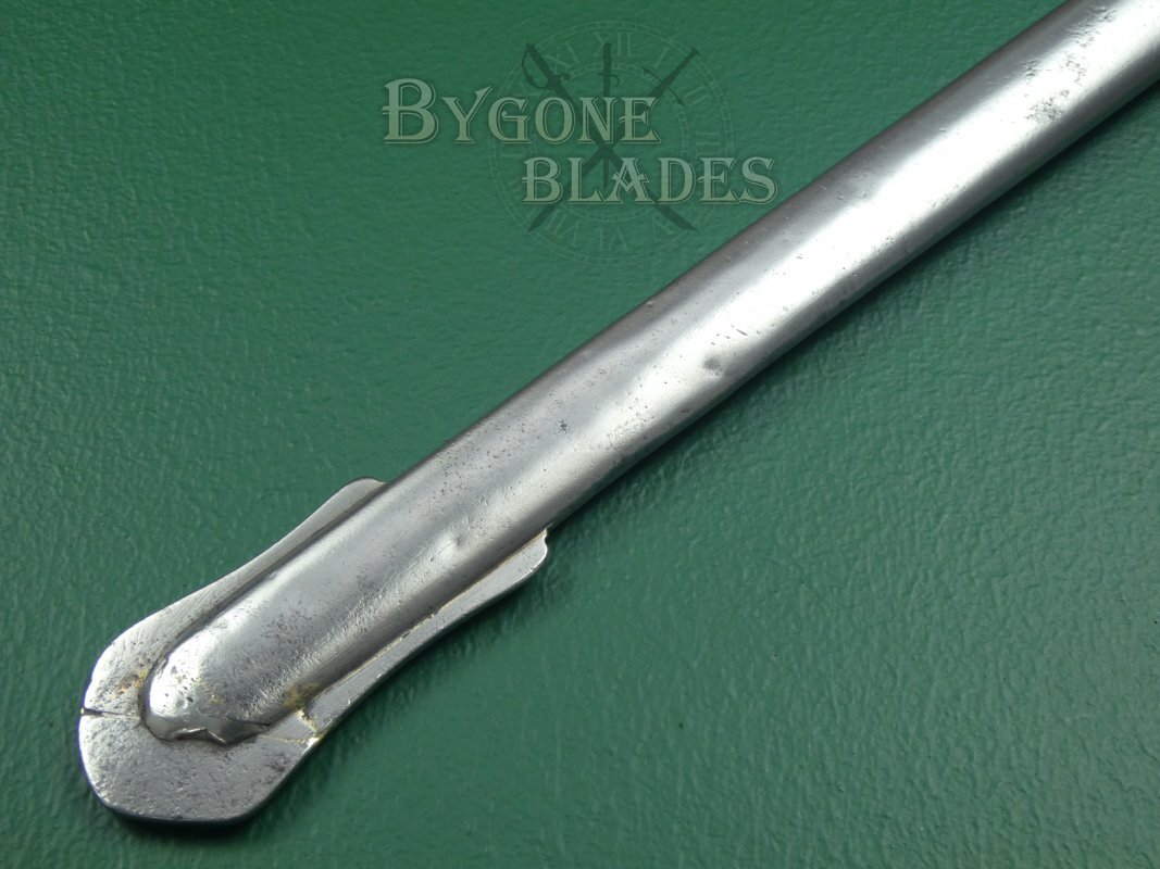 The sword is complete with its polished iron scabbard with a German silver throat and two suspension rings. The scabbard is in good condition with patches of tarnish and shallow pitting. The shoe of the scabbard has a period braised repair. It looks as if a portion of the shoe has been replaced – probably due to excessive wear on the original. The sword sheathes and draws smoothly and is held firmly within the scabbard.
