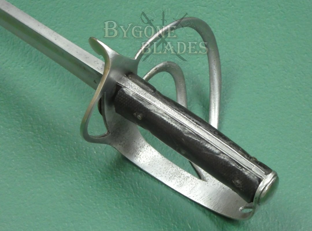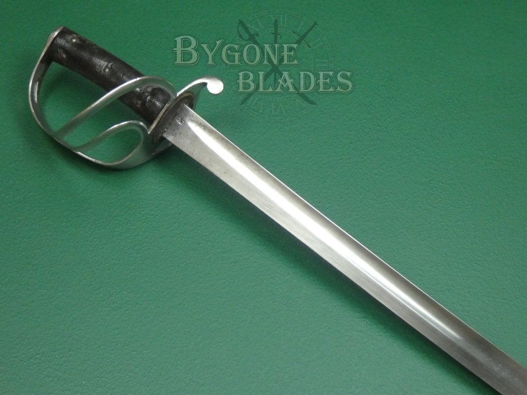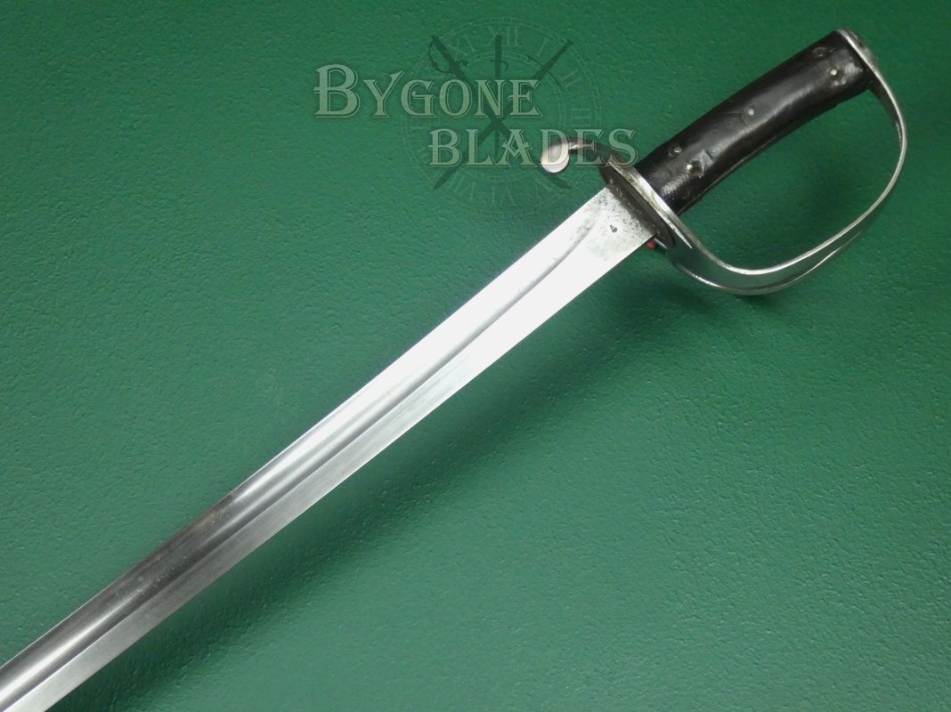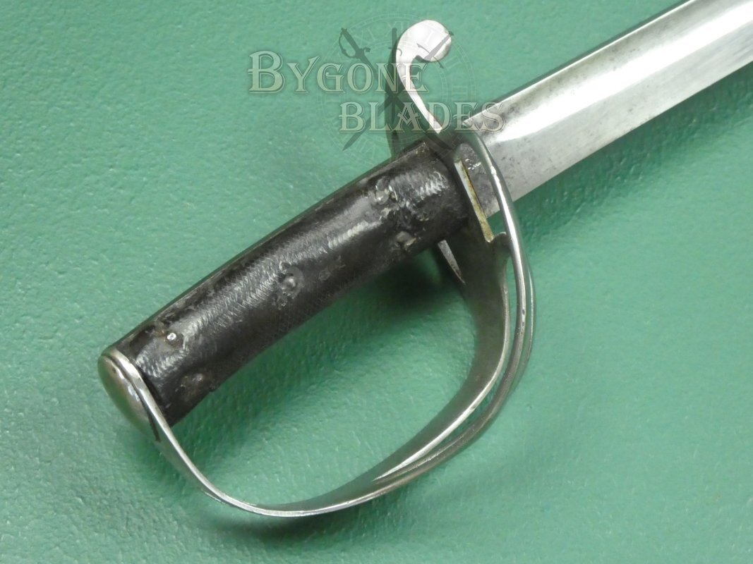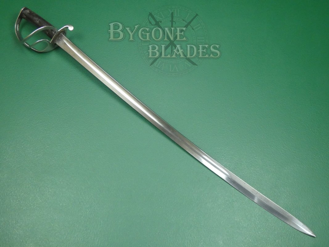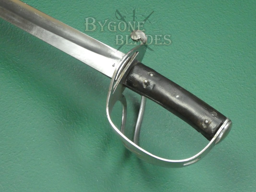 The 1853 pattern British cavalry sword was the first sword to be issued to troopers of both light and heavy cavalry regiments. The sabre was also issued to troopers of the Royal Horse Artillery. It was the first issued sword to utilise Reeves “Patent Solid Tang,” the blade and tang being of one piece instead of the iron “rat-tail” tang that was traditionally forge-welded on to the steel blade. This of course made for a much stronger sword, more rigid and far less likely to suffer a catastrophic failure having eliminated the junction between blade and tang.