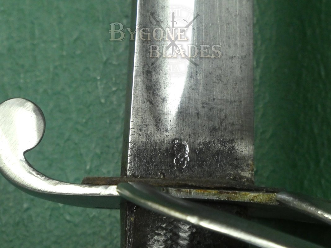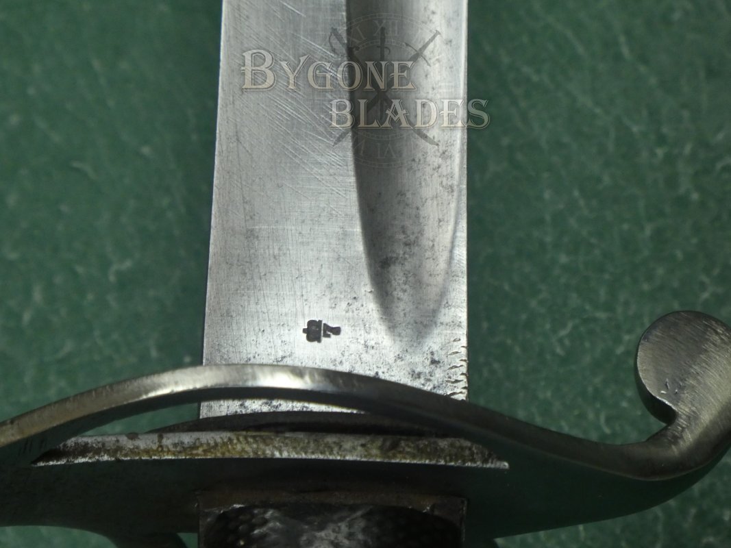 The ricasso bears the Ritter, the knight’s helmet stamp of the Solingen based Kirschbaum company. The obverse ricasso is stamped with a British Tower inspection mark, a crown over the numeral 7.