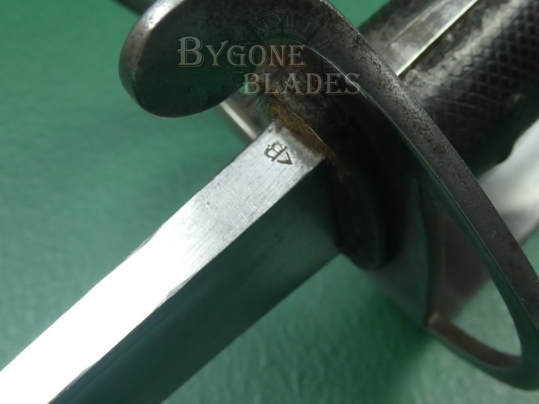 The spine bears a pre-1856 government ownership mark, a crowned Broad Arrow. The ricasso is stamped with a Liege based factory inspectors stamp. In order to increase production and equip troops with the new pattern sword, Belgian makers, based in Liege were awarded contracts to produce the P1853 at the onset of the Crimean War. British inspectors were sent to oversee production and unofficially, ensure that the factories were not producing arms for the Imperial Russian army.