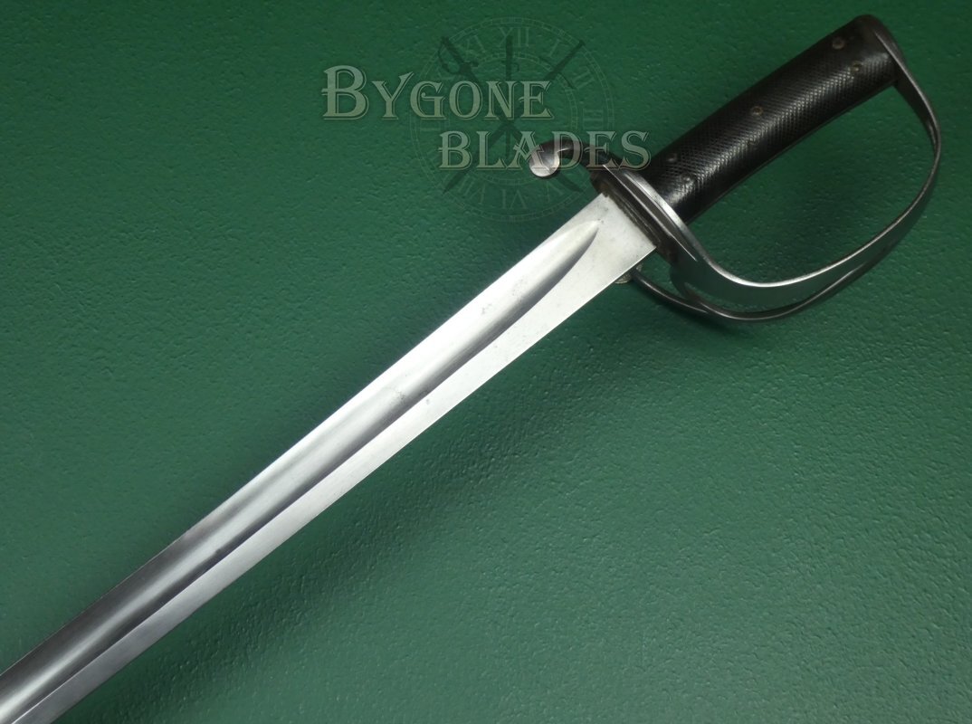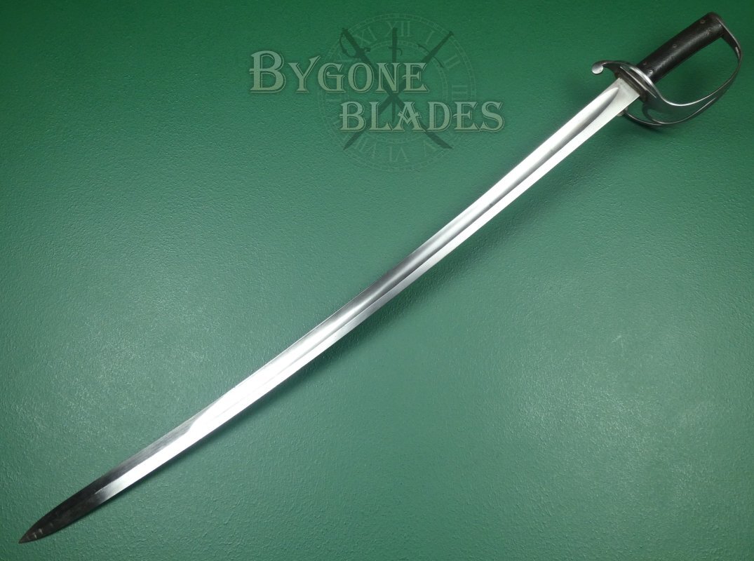 The 890mm single-edged blade is slightly curved and has a thick, flat spine with a single fuller and terminates in a spear point. The blade is in very good condition, bright and clean with only a few isolated spots of minor tarnish and light scratches towards the point. The blade retains its factory edge.