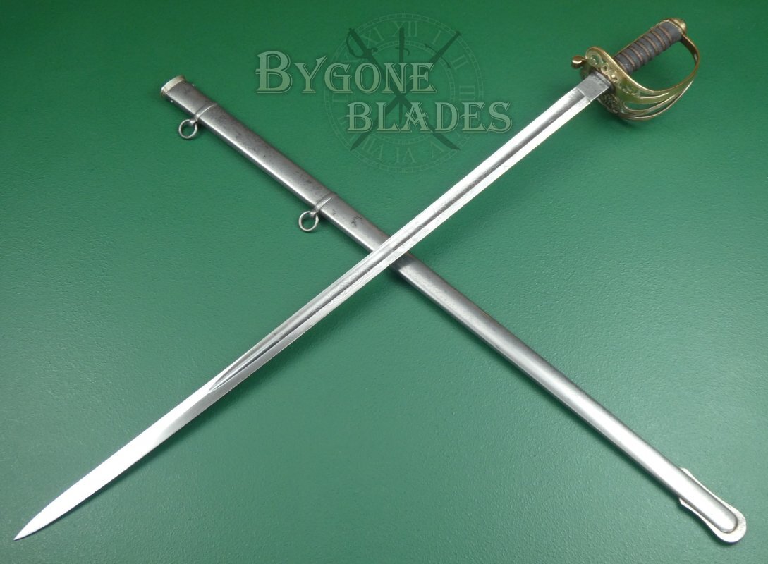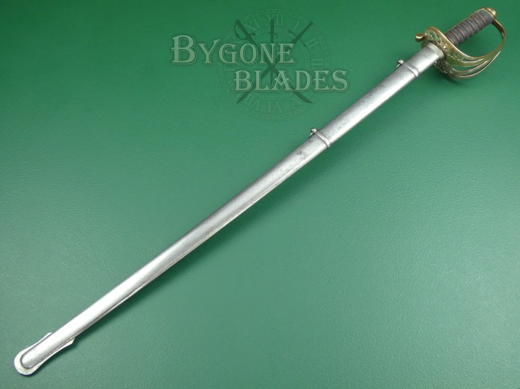 The sword is complete with its steel scabbard with twin suspension rings. The scabbard is in very good condition with a mild speckling of tarnish. The sword sheathes and draws smoothly and is held firmly within the scabbard.