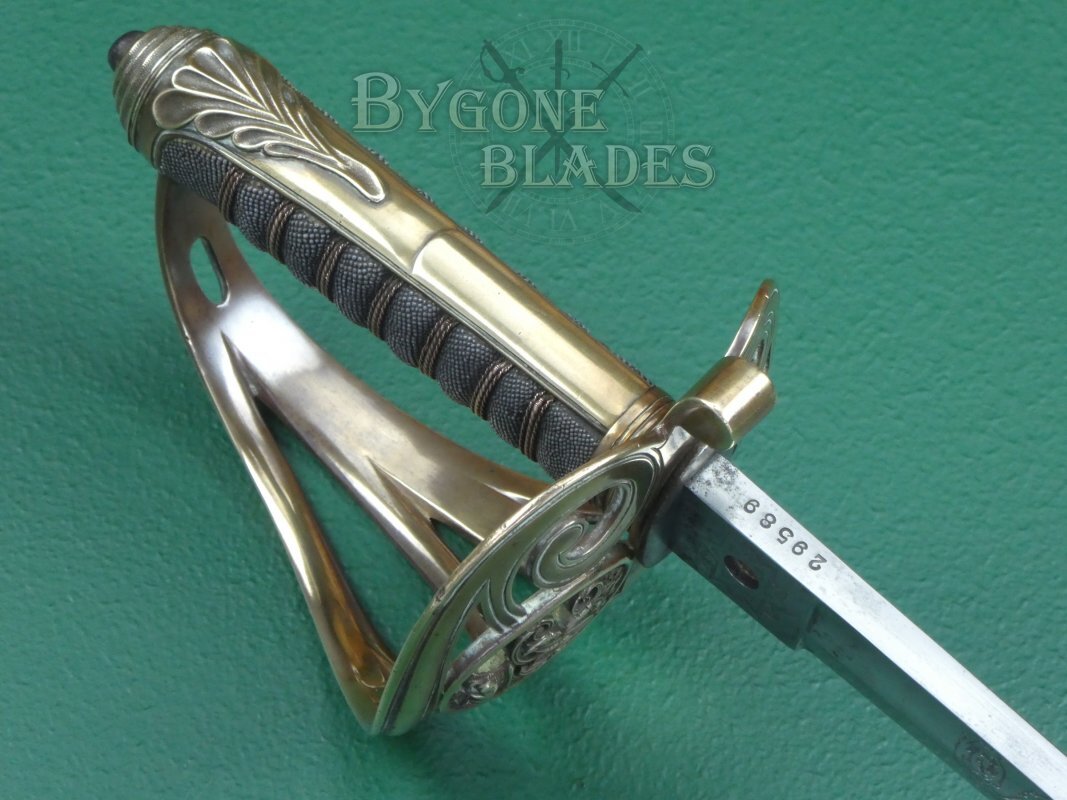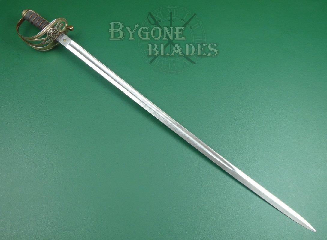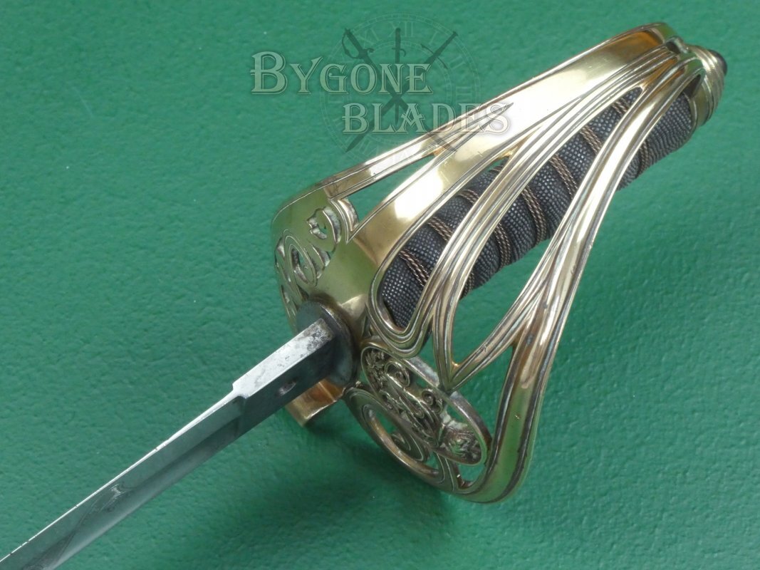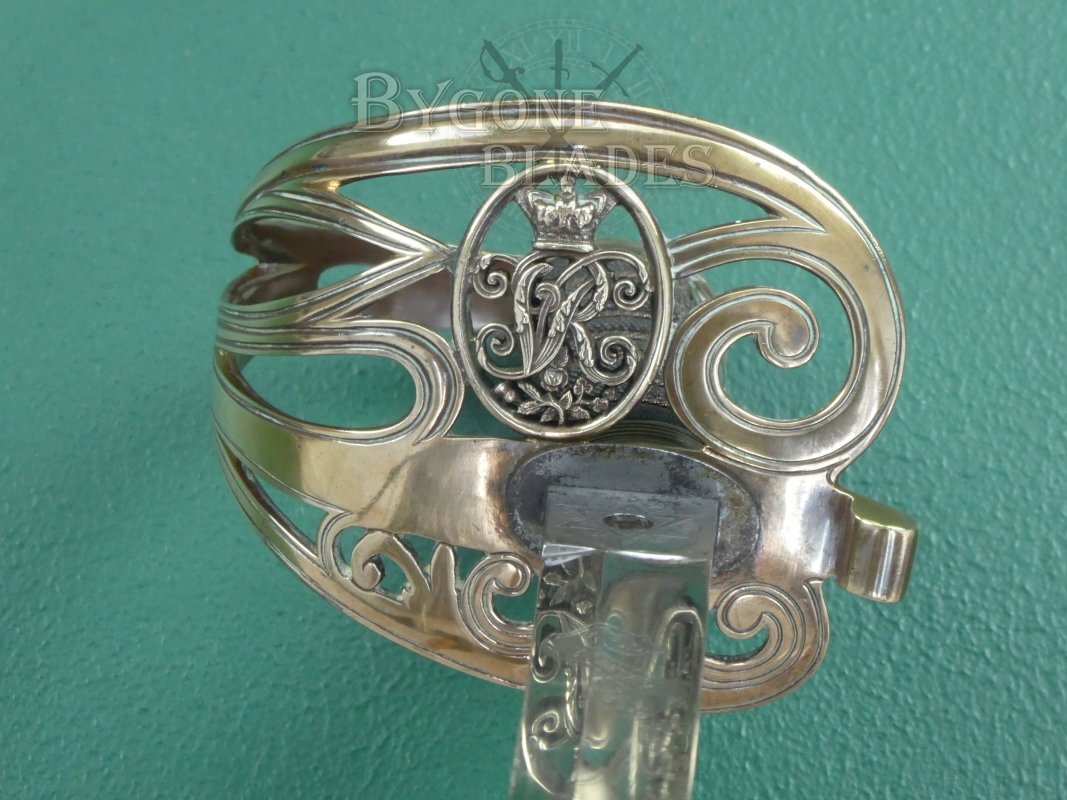 The Gothic brass guard is in excellent condition and retains its gilding. An oval within the guard bears the cypher of Queen Victoria above the Flowers of the Union. The shagreen wrapped grip is in excellent condition and the twisted copper wire is intact and tight. The blade is firm in the hilt.