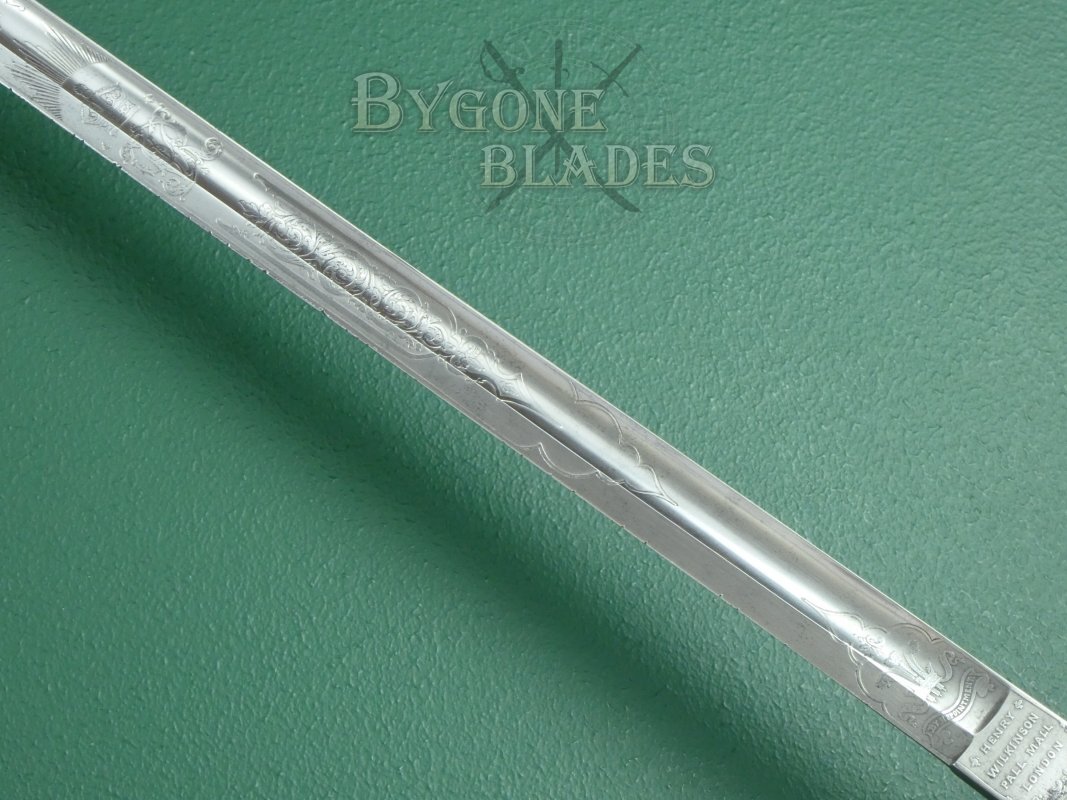 The 845mm 1845 “Wilkinson” pattern blade has a 10mm flat spine with a broad fuller running for over two-thirds of its length. The blade terminates in a spear point and is deeply etched with panels of scrolling foliage above and below a rayed crown and the cypher of Queen Victoria. A scrolled banner on the forte bears the owners’ initials, “J. A. T. T.” The obverse of the blade is etched with similar foliate panels and the crowned cypher of Queen Victoria. The forte is etched with the Prince of Wales crown and three feathers with the motto, “Ich Dien.”  The ricasso bears the maker’s details, “Henry Wilkinson, Pall Mall, London.” The spine bears the Wilkinson serial number 29589, dating the sword to 1889.