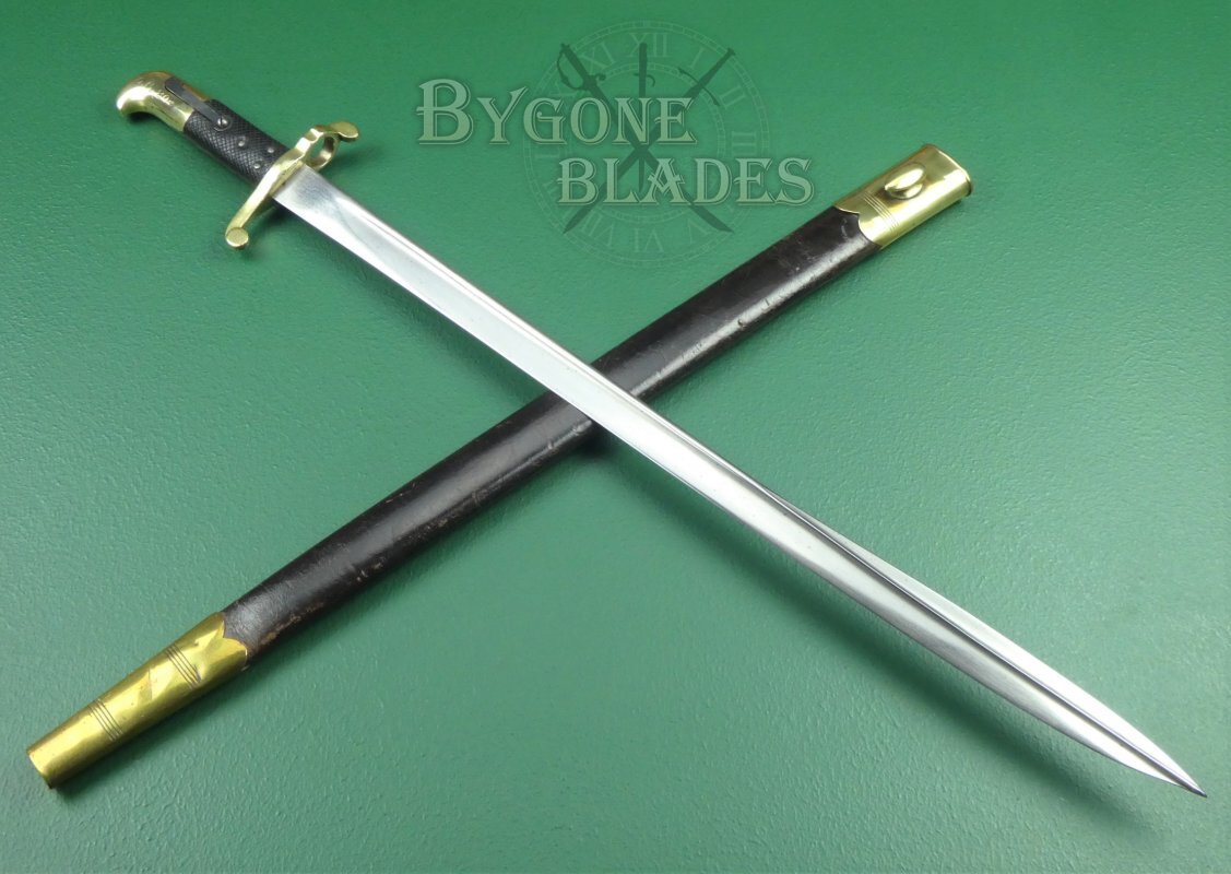 The P1855 is a very distinctive bayonet with a pipe backed blade and quill point. Possibly one of the best looking bayonets produced for the British army. The popular and growing volunteer movement within the UK during the 1850’s resulted in a commercial model of the Lancaster bayonet being produced for the Volunteer and colonial markets. This bayonet is one such example and is identical to the service pattern but without the government ownership and inspection marks.