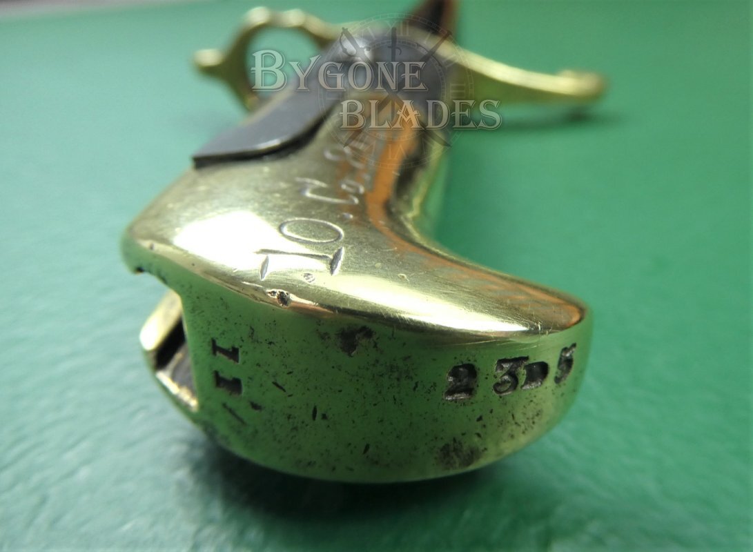 The iconic brass cross guard and bird-beak pommel are in excellent condition. The cross guard is stamped with v3 and a corresponding v3 is stamped on the scabbard throat.