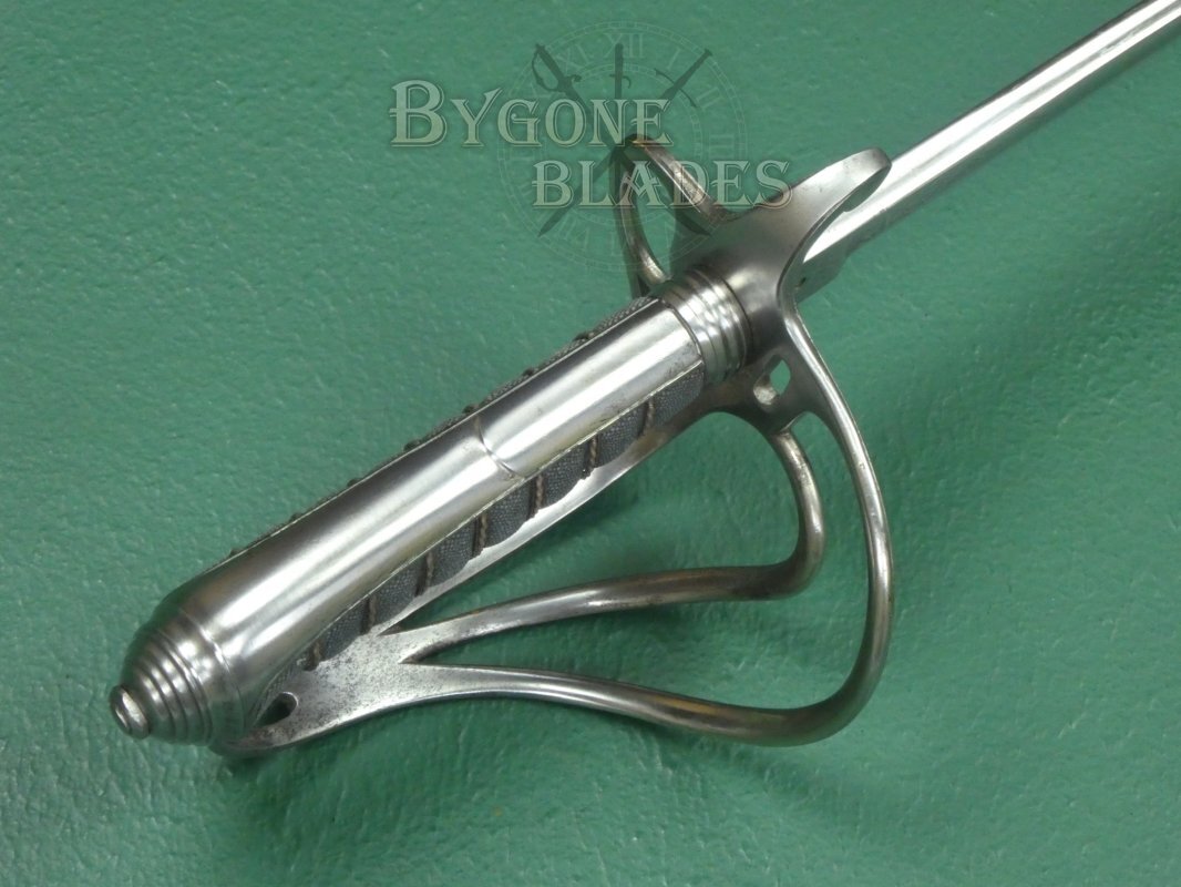 The three-bar steel guard is in very good condition. The shagreen covered grip is in great condition and the three strands of twisted wire are intact and tight. The blade is firm in the hilt.
