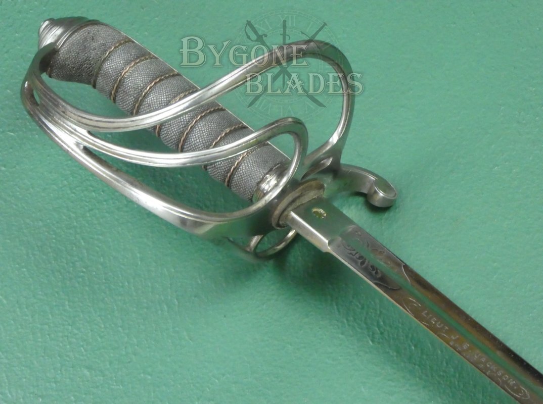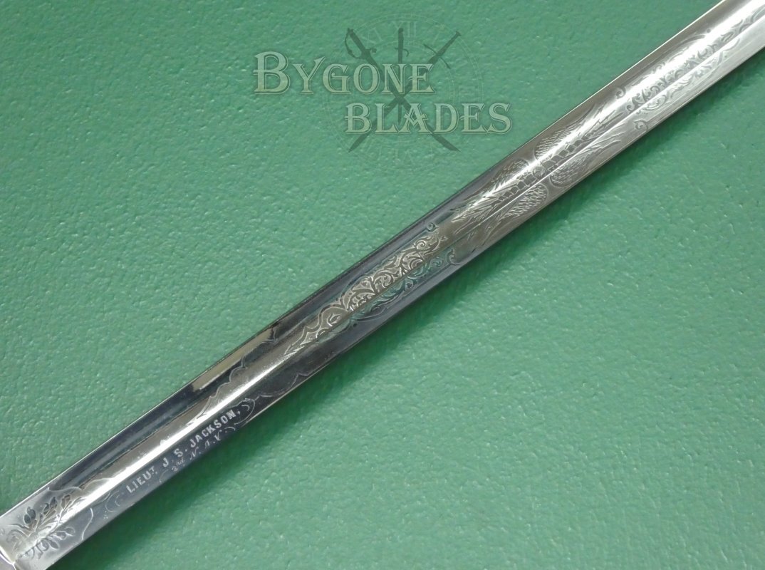 The blade is etched with ogee and trefoil arches and foliate scrollwork above and below the winged lightning bolts of the Artillery. The forte is engraved with the owner’s name; Lieutenant J. S. Jackson. 2nd N. A. V.