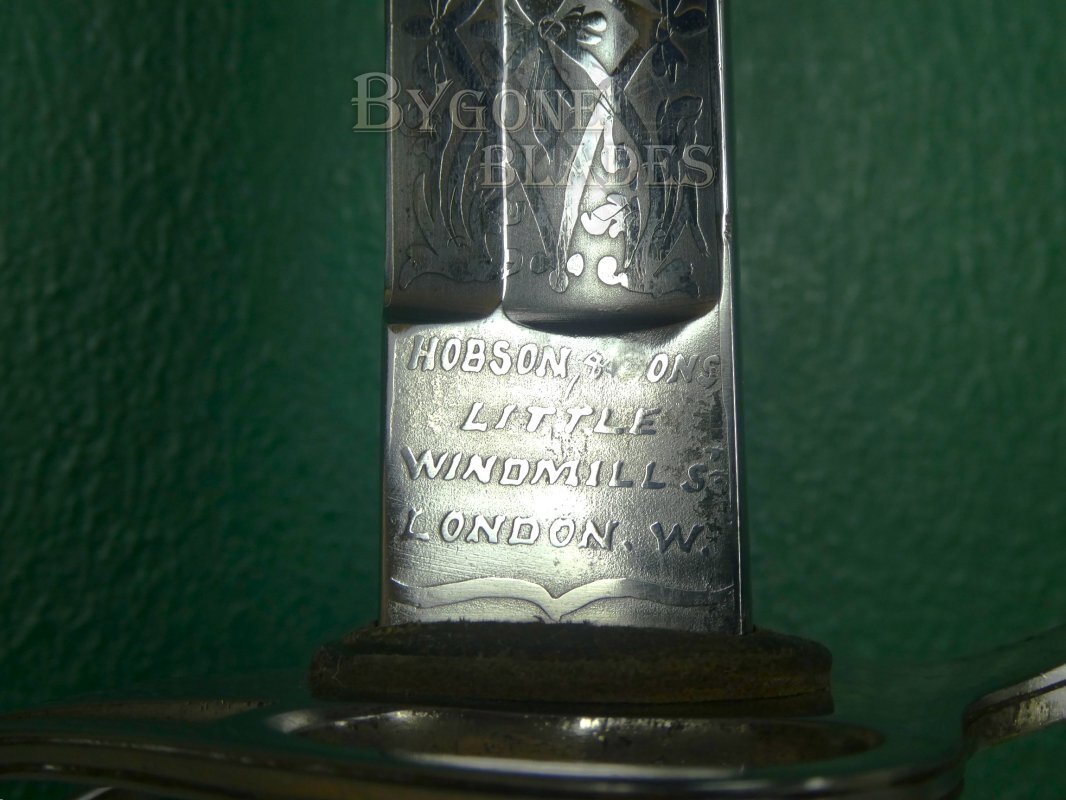 The ricasso bears the brass proof disk of George Alfrad Pillin. The obverse ricasso bears the cutler’s details, Hobson & Sons. Little Windmill Street, London. W.