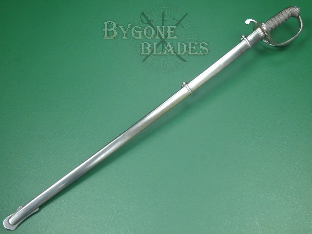 The sword is complete with its polished steel scabbard with twin suspension rings. The scabbard is in very good condition with some faint, light scratches and small patches of pale speckled tarnish. The sword sheathes and draws smoothly and is held firmly within the scabbard.