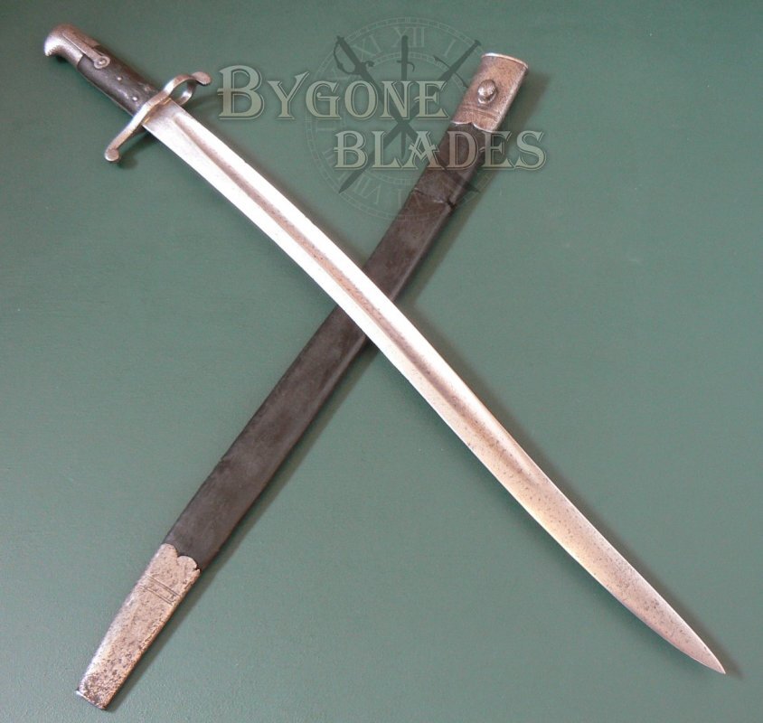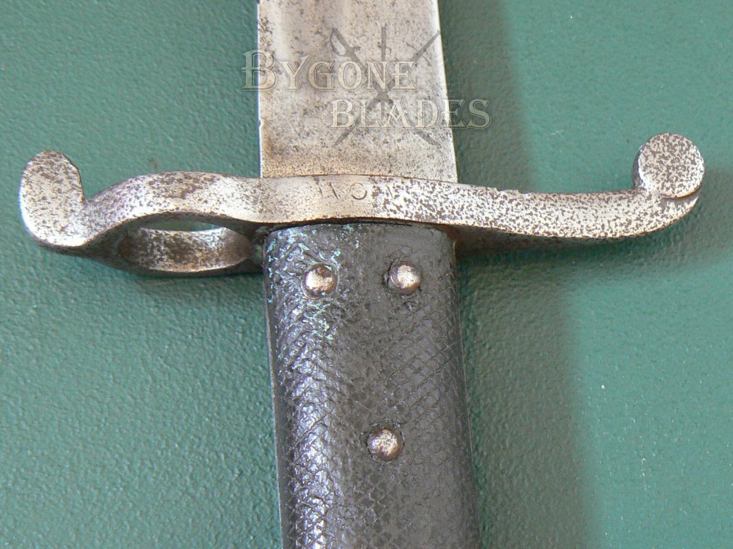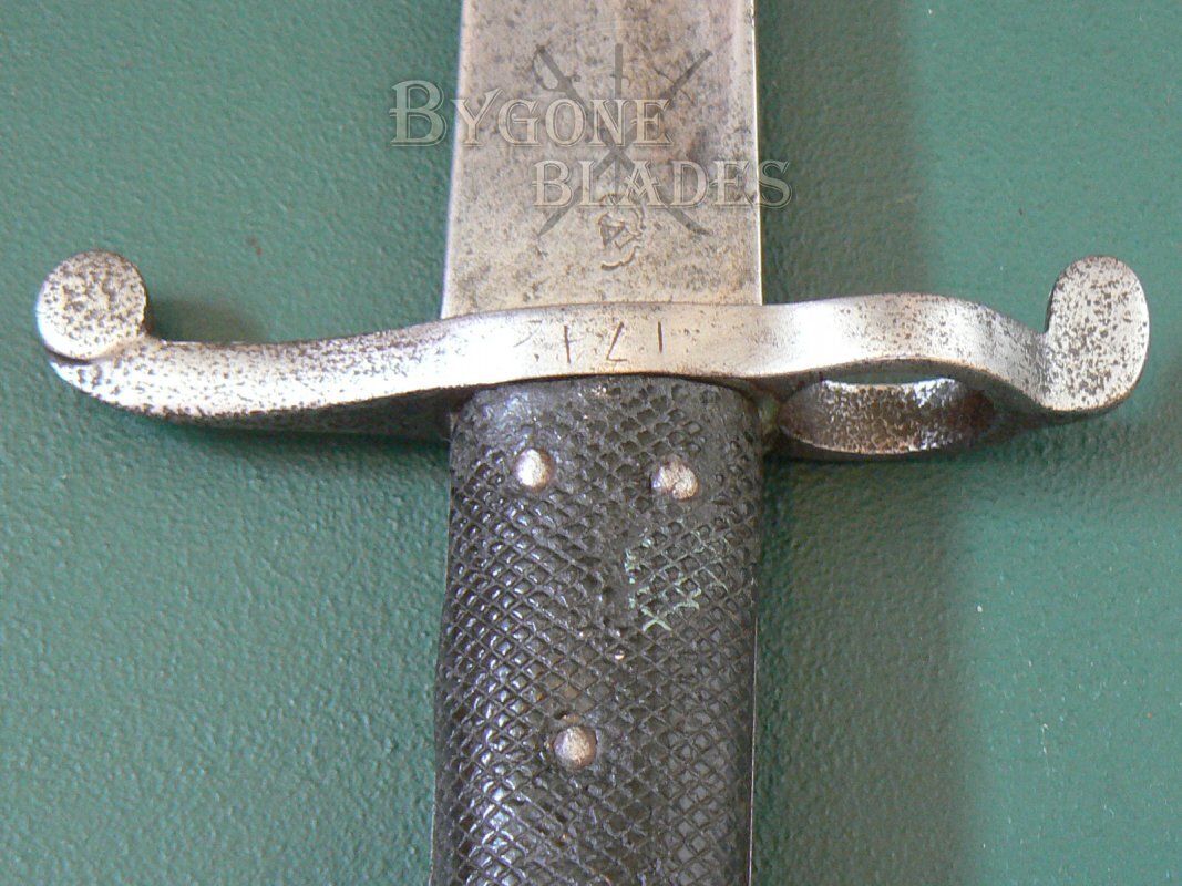 This rare pattern 1856/58 British sword bayonet was made for the Model 1853, .577 calibre Enfield (2-band) rifled infantry short-musket. As well as being issued to British units, these rifles and bayonets were sold in large numbers to both the Union and Confederate armies during the American Civil War. This bayonet is a typical example, as it does not bear British military issue or War Department ownership stamps.