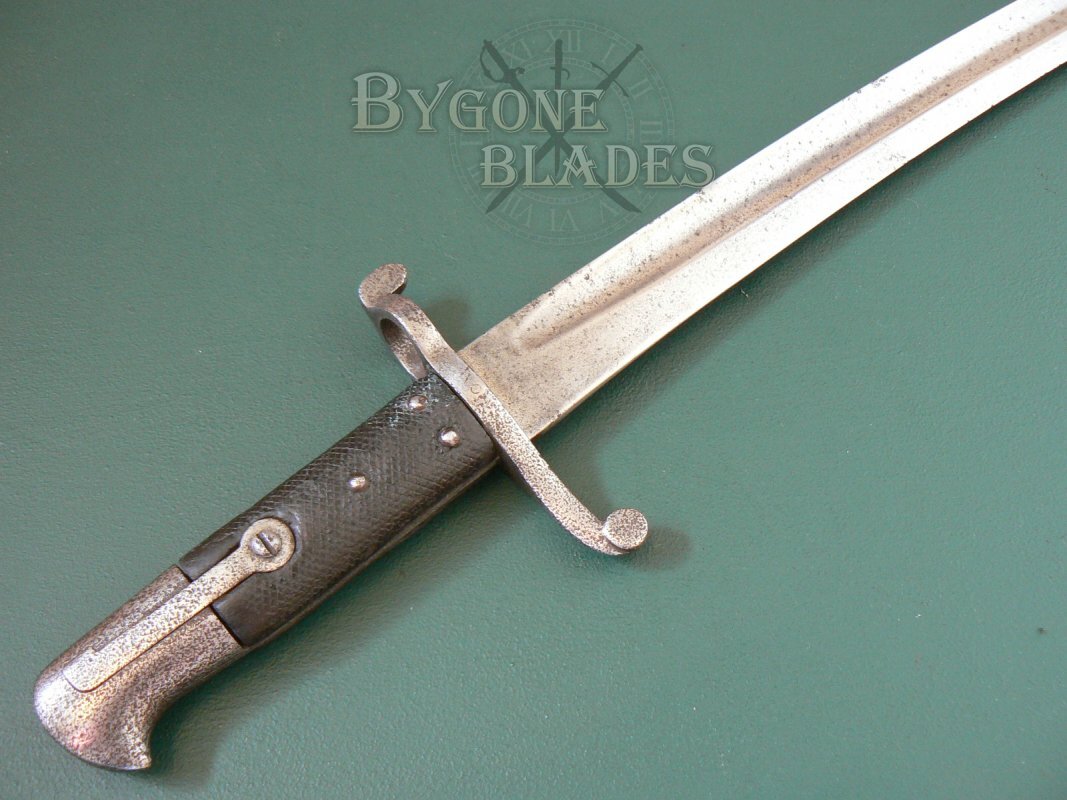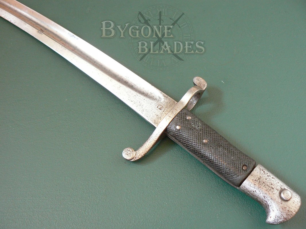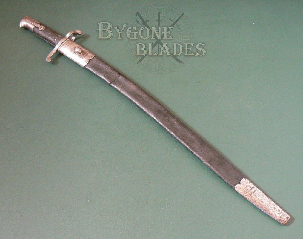 The bayonet is complete with its original leather scabbard with steel mounts. The steel furniture has a mottled age patina and shallow pitting. There are a couple of small rust perforations at the tip of the chape. The leather is in fair condition, there are shrinkage cracks along its length and a crack in the outer finish about a third of the way down. The stitching has perished but the leather itself is strong. The bayonet sheathes and draws smoothly from the scabbard.