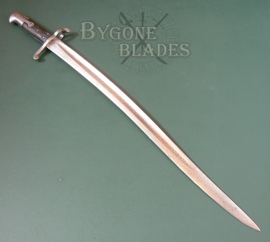 The 577mm yataghan blade has a flat spine and broad single fuller on both sides. The recurved blade is double-edged for the last 120mm. The blade was service sharpened. The ricasso bears the Knight’s helmet logo of the makers, Kirschbaum, of Solingen, Germany. The absence of any British use or ownership stamps indicates that this bayonet was produced in Germany for export. The main export market for these bayonets at this time was America, for use in the American Civil War.