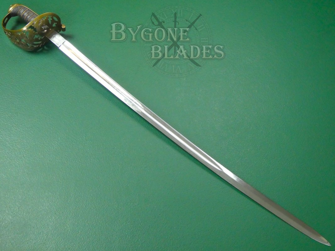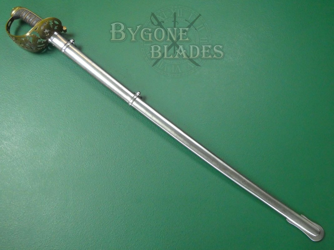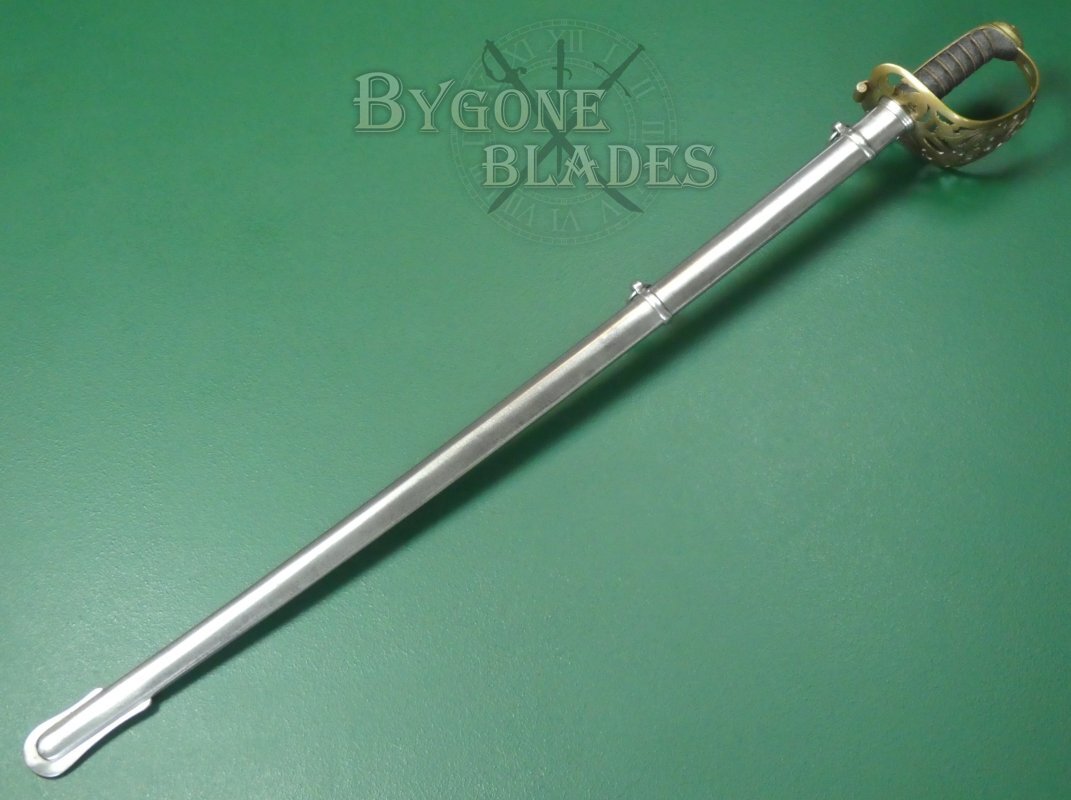The shoe of the scabbard bears a Birmingham inspection stamp and the obverse bears a Birmingham refurbishment stamp. The scabbard is without dents or damage and has a great patina. The sword sheathes and draws smoothly and is held firmly within the scabbard.
