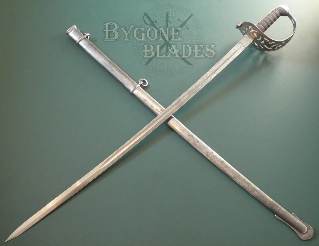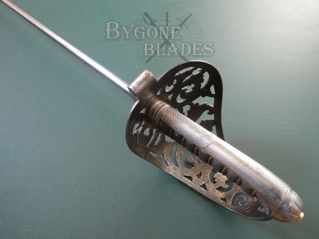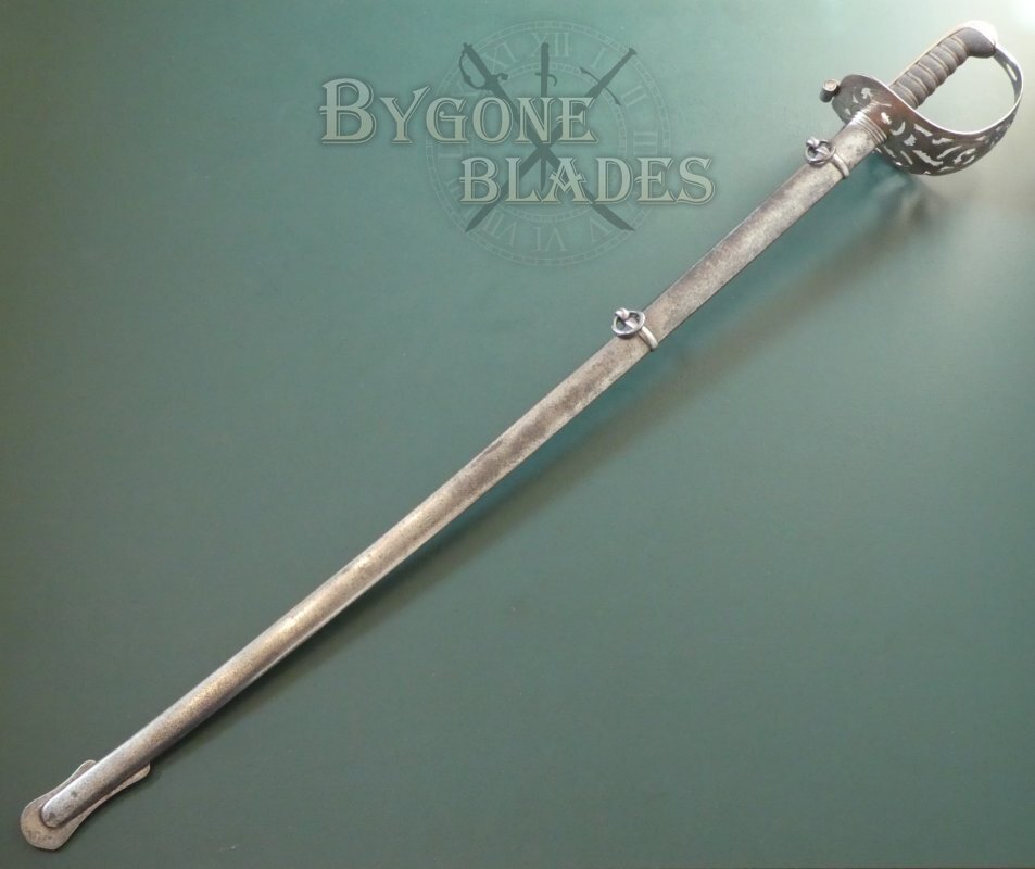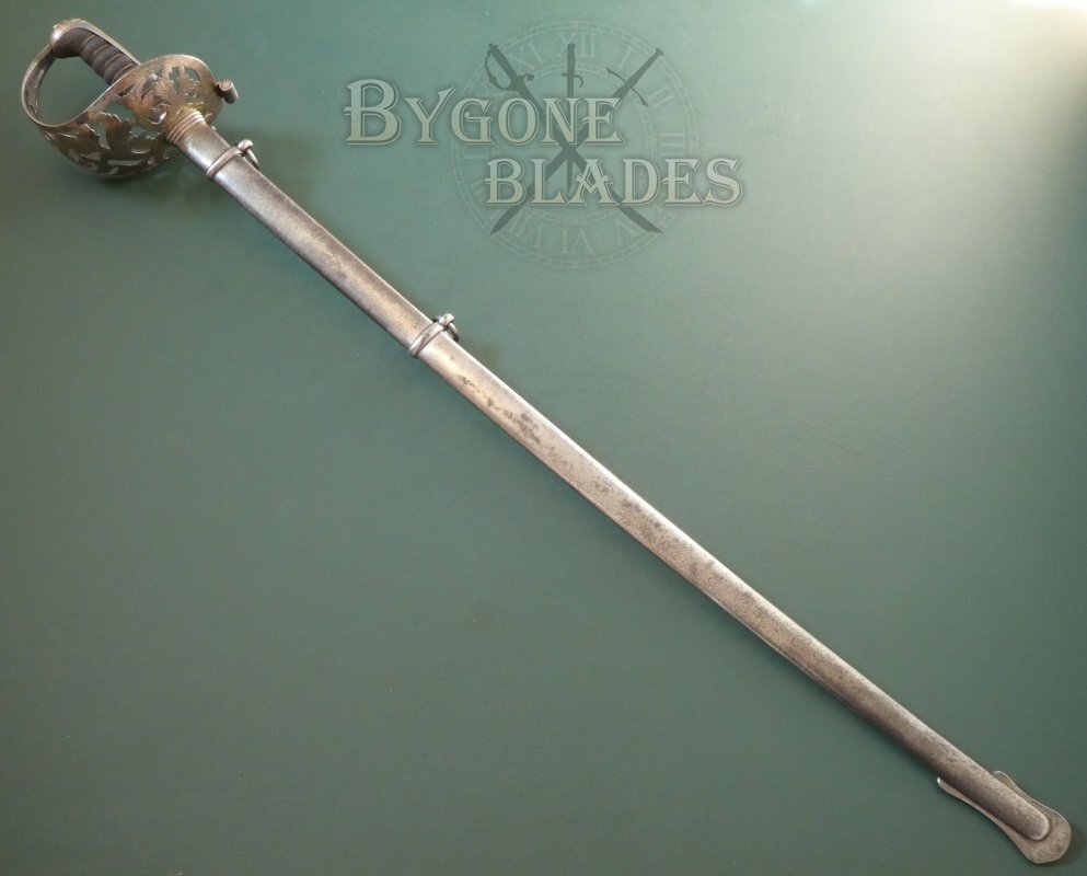 The sword is complete with its original steel scabbard with two suspension rings. The scabbard is in good condition and dent free with a mild age patina and areas of tarnish. The sword sheathes and draws smoothly and is held firmly within the scabbard.