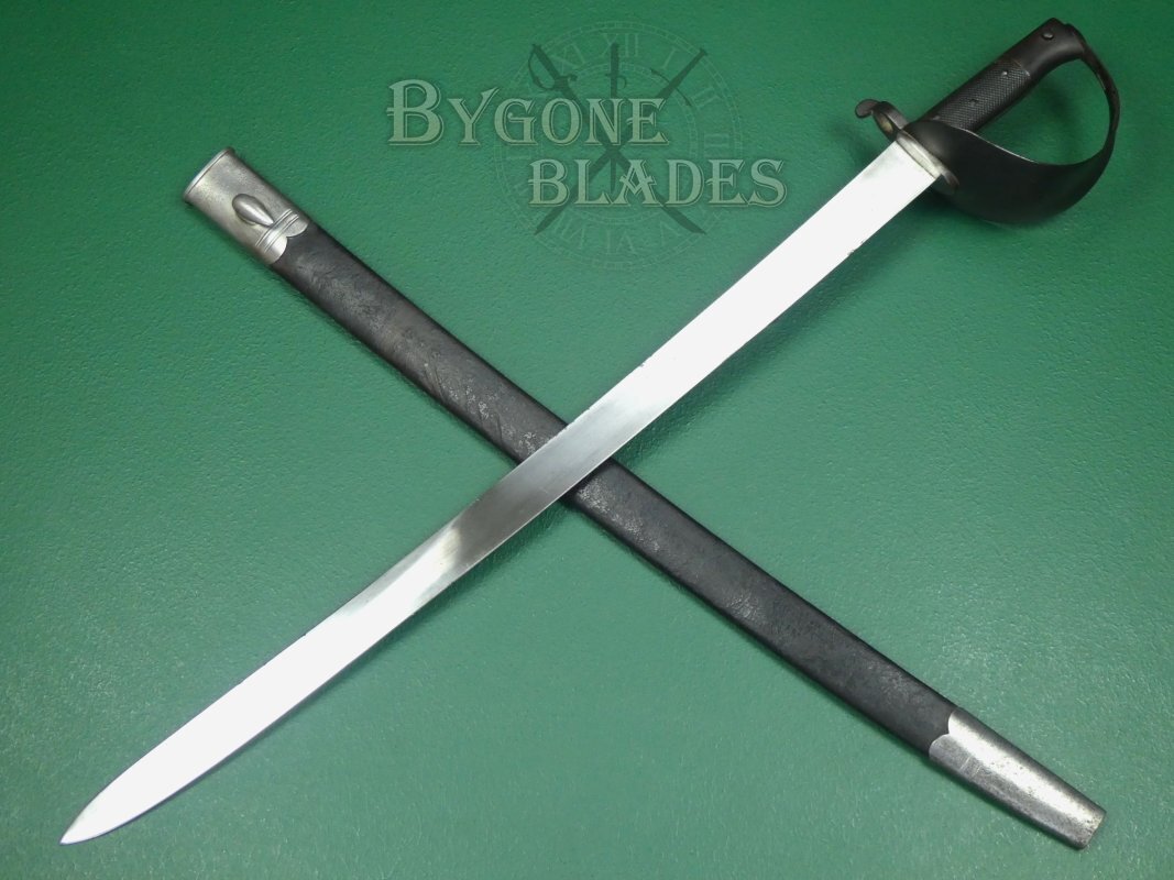 The cutlass bayonet is complete with its original black leather, steel mounted scabbard. The leather is in excellent condition with the stitching intact and tight. There are age and use related scuffs to the leather. The steel locket and chape are in good condition with a speckling of tarnish and very shallow pitting.