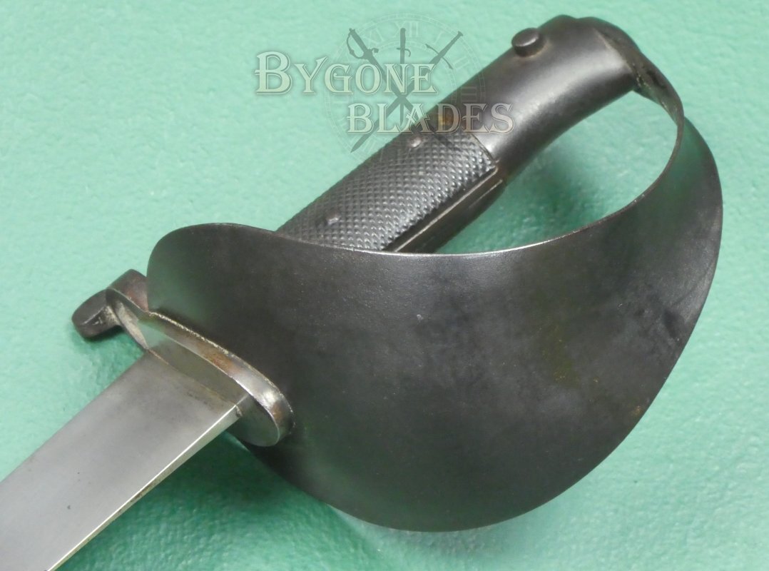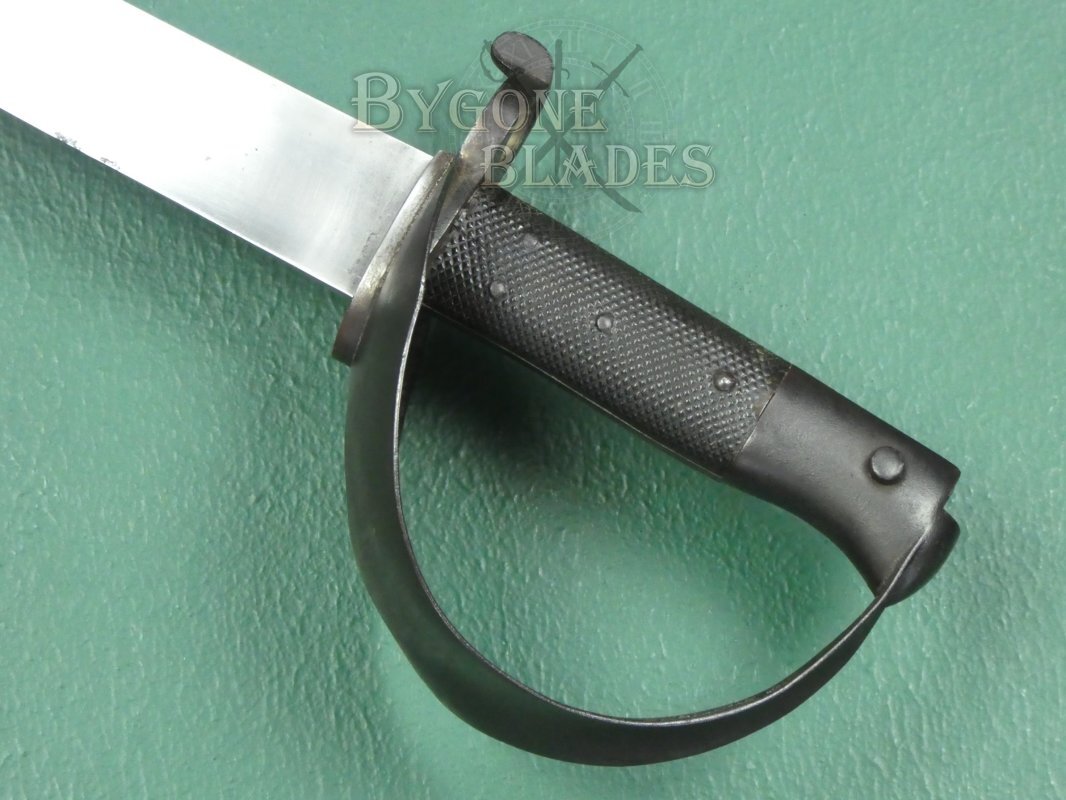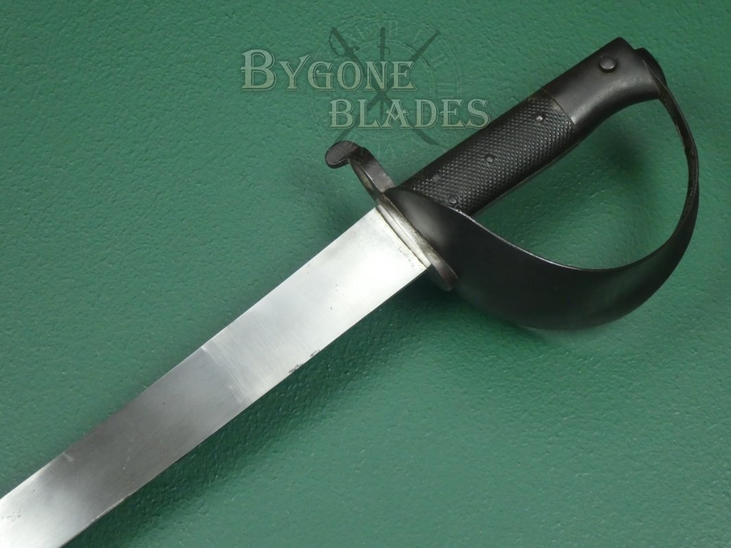 The blackened steel bowl guard is in excellent condition. The chequered leather grips are in similarly excellent condition and the external spring catch works perfectly. The lack of British War Department or Naval ownership and inspection stamps suggests that this cutlass bayonet was one of those made for export.