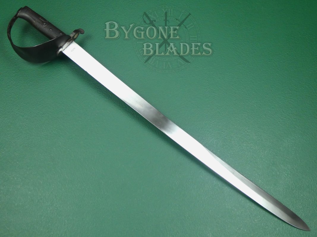 The 680mm un-fullered blade has a flat spine and single-edge. The blade terminates in a spear point and has a 240mm upper false edge. The blade is in excellent condition and was service sharpened. The forte is stamped with an oval cartouche containing the maker mark "A. & E. H." A. & E. Holler of Solingen Prussia who used this trademark between 1854 and 1885.