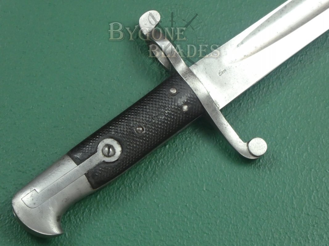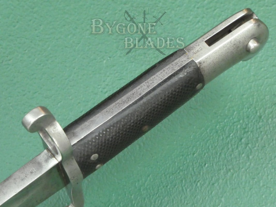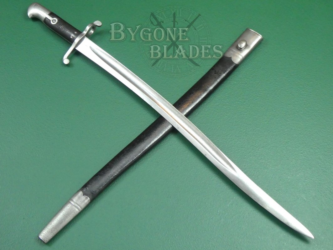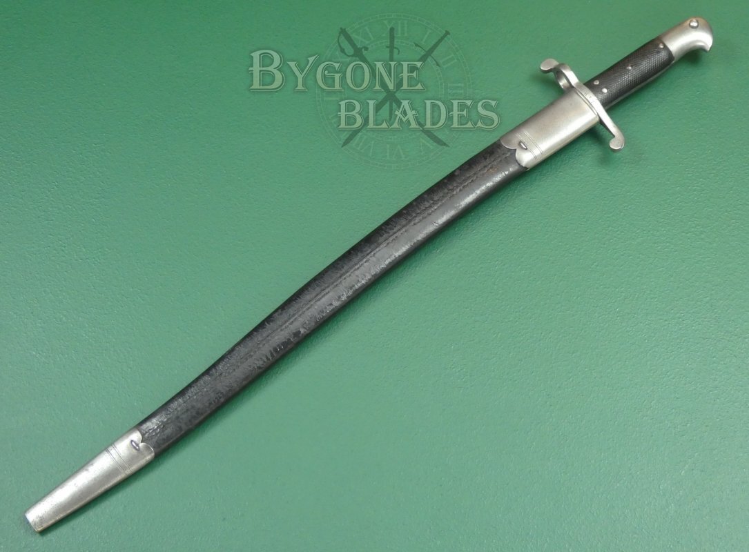 The bayonet is complete with its original issue scabbard. The leather scabbard with steel furniture is in very good condition. The frog stud is stamped with the number 16.