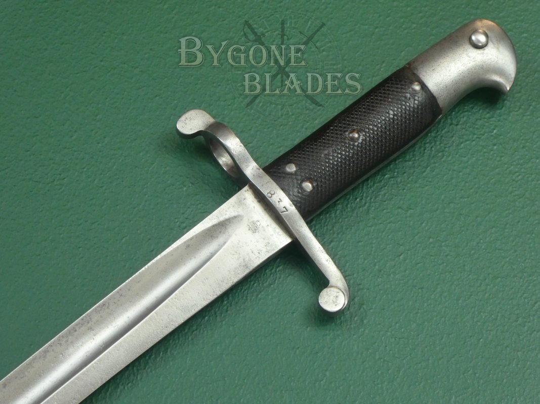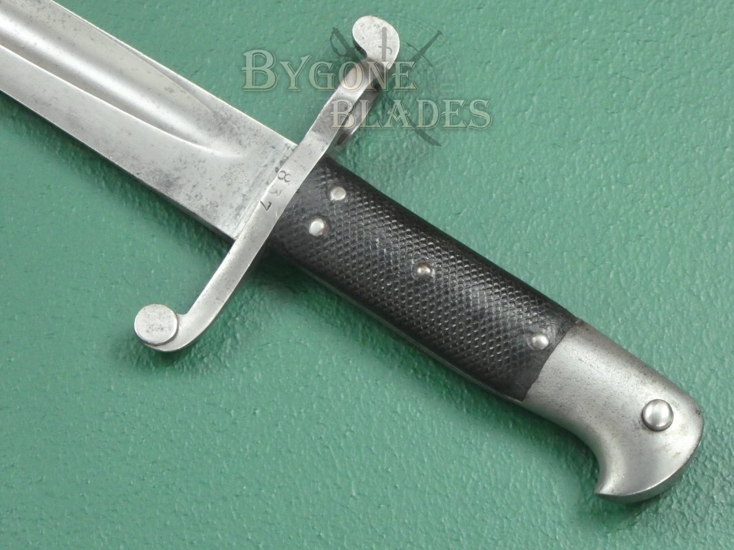 The steel hilt and crosspiece are in very good condition, the crosspiece, terminating in a disk finial opposite the coxcomb muzzle ring, is stamped with the number 837. The beaked steel pommel bears an Enfield inspection stamp at the top of the mortice slot. The press-stud and leaf spring are in good working order. The leather grip scales are in good condition and each scale bears a worn Enfield inspection mark.