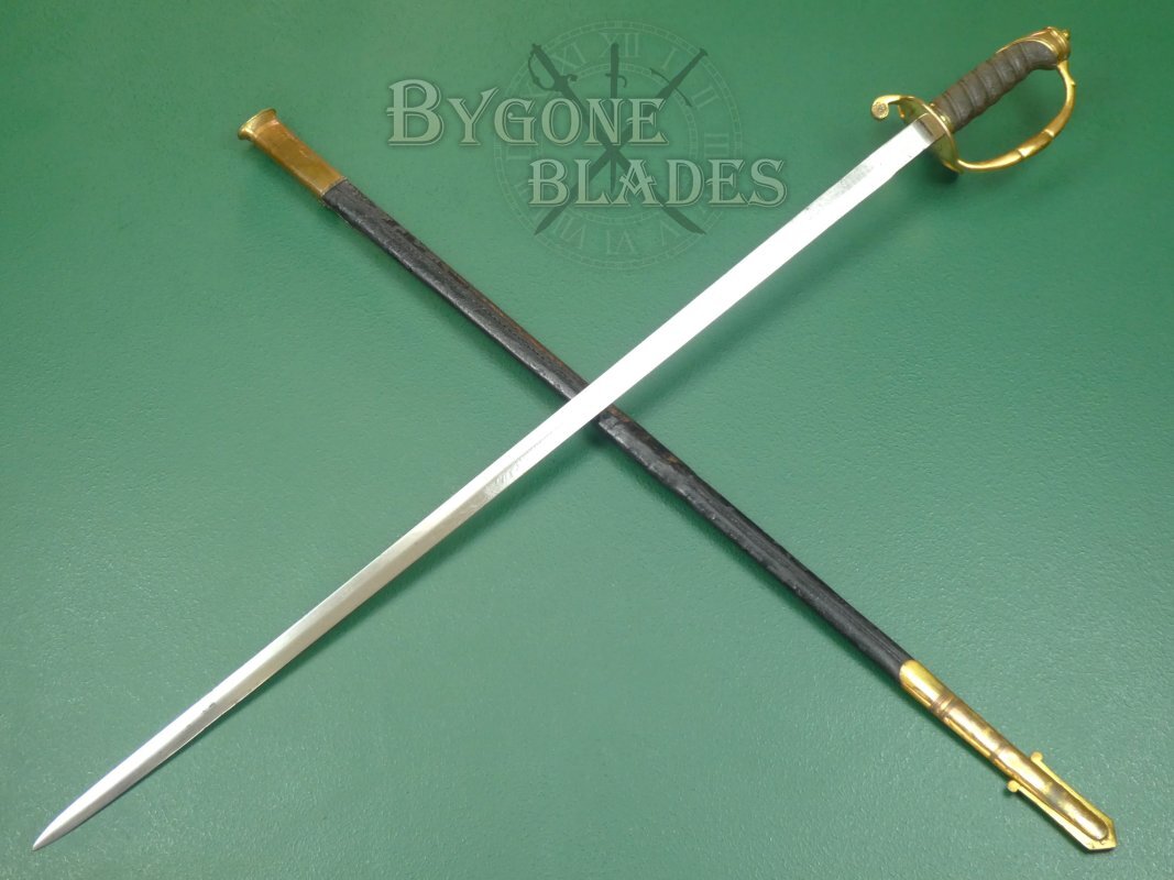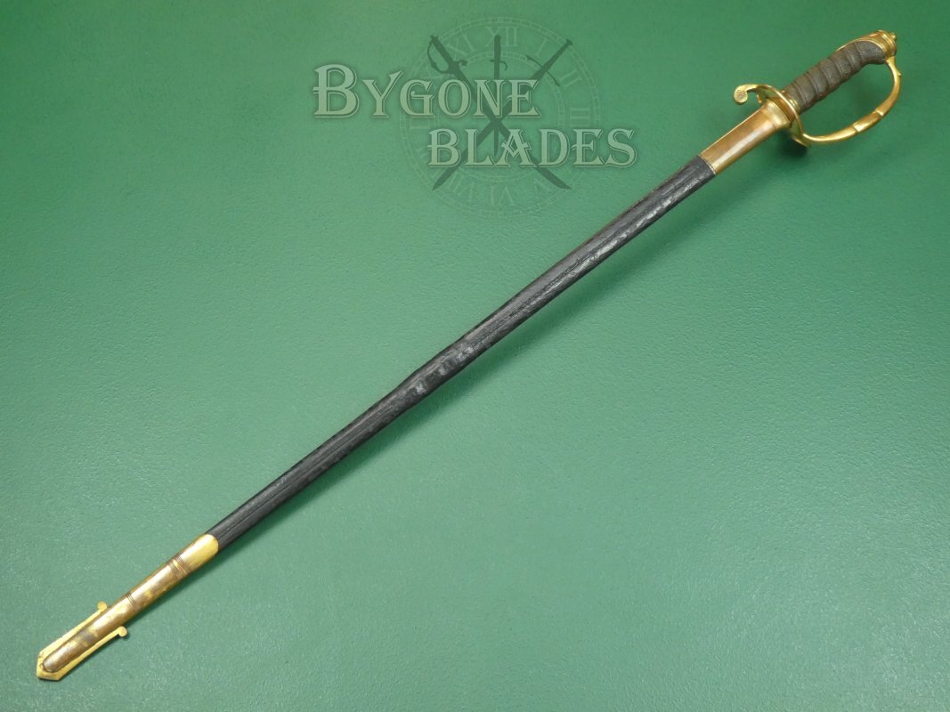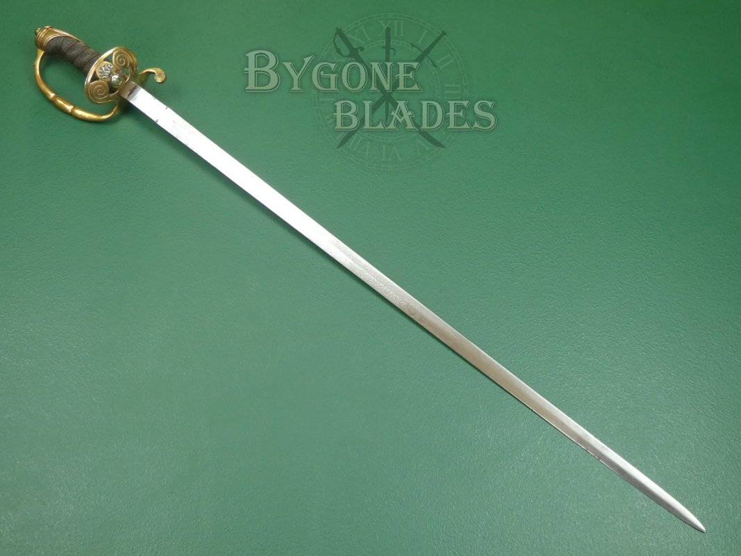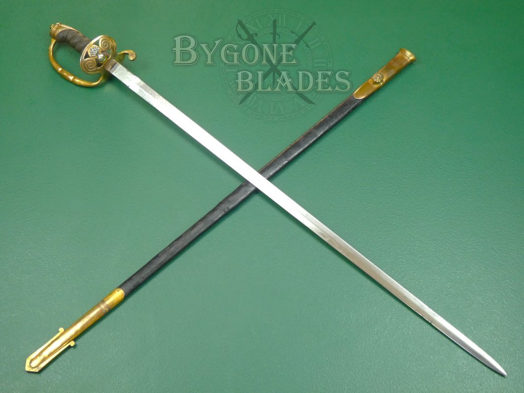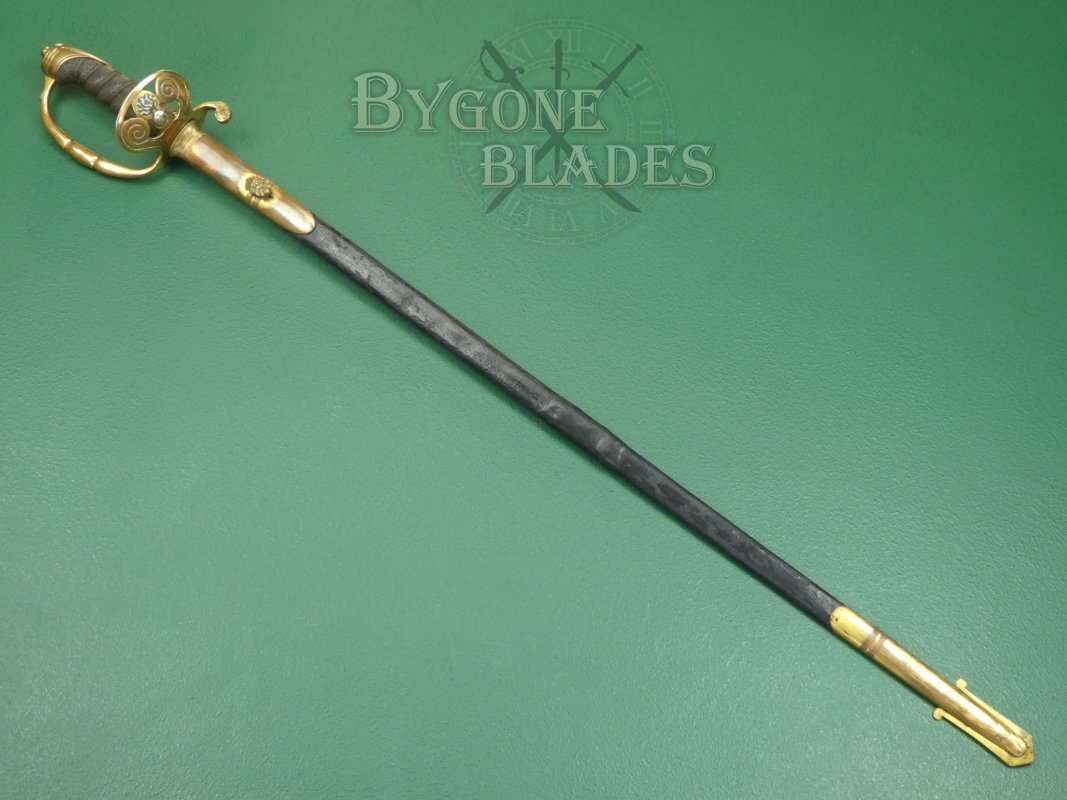 The sword is complete with its black leather scabbard with gilt brass locket and chape. The locket bears a flower head frog stud. The leather of the scabbard is in good condition with a near-invisible period repair. The stitched seam is intact. The sword sheathes and draws smoothly and is held firmly within the scabbard.