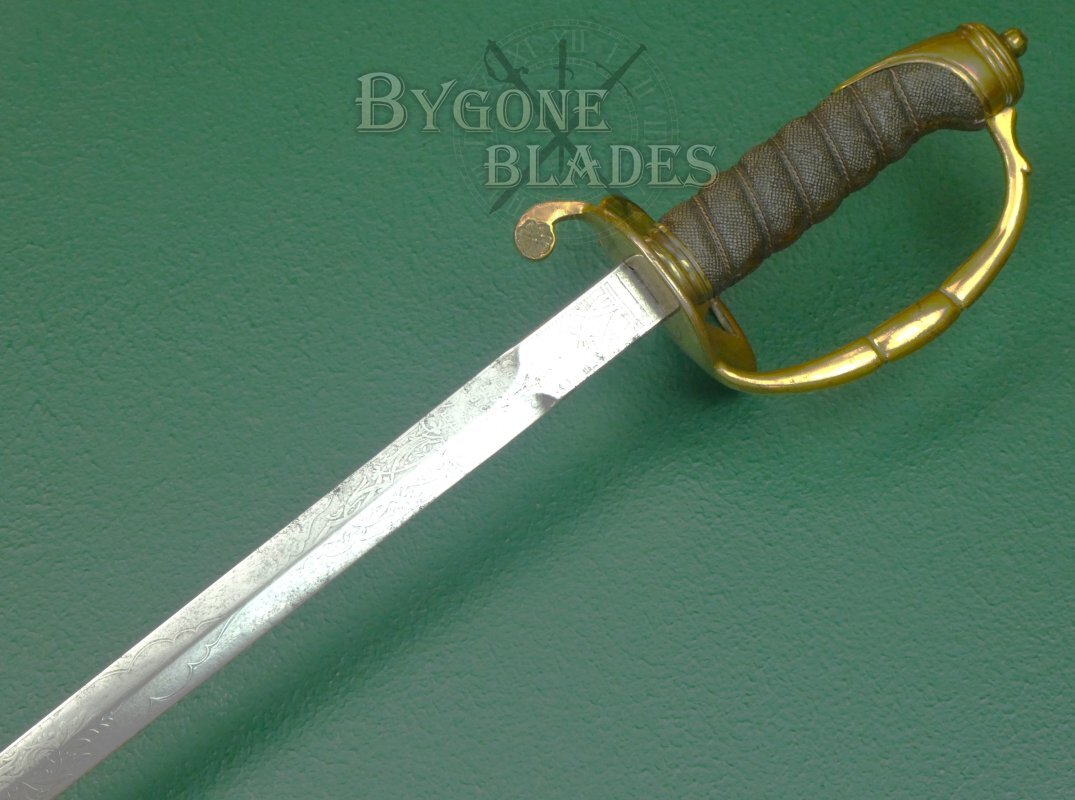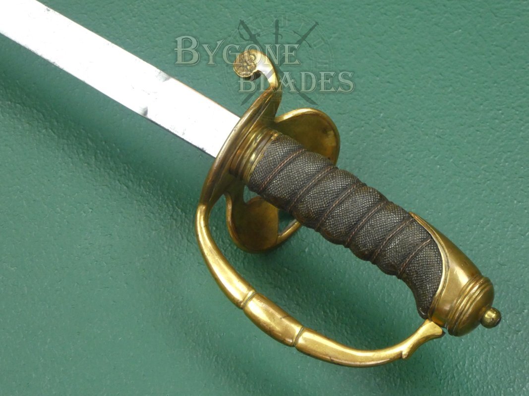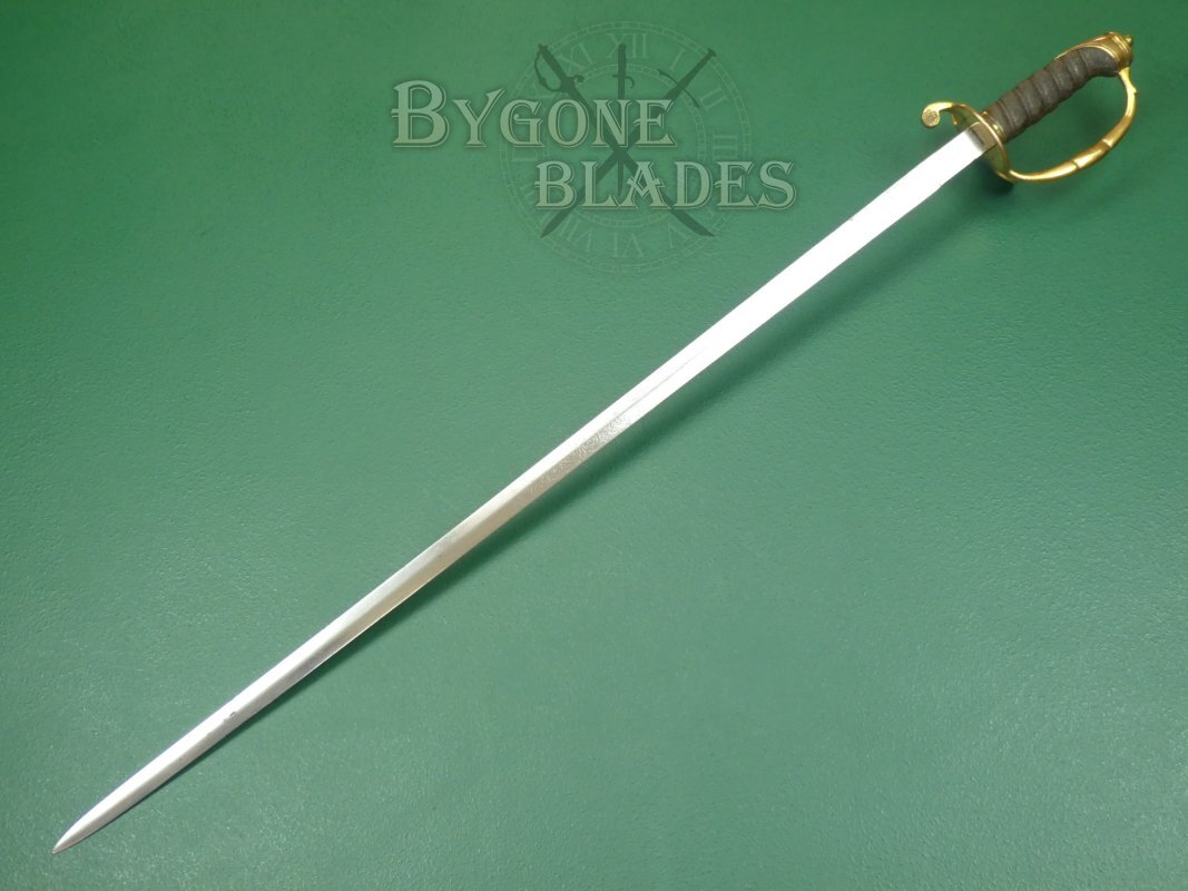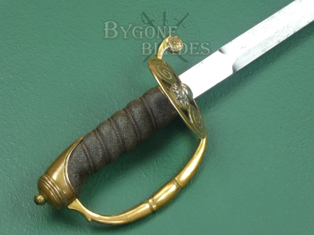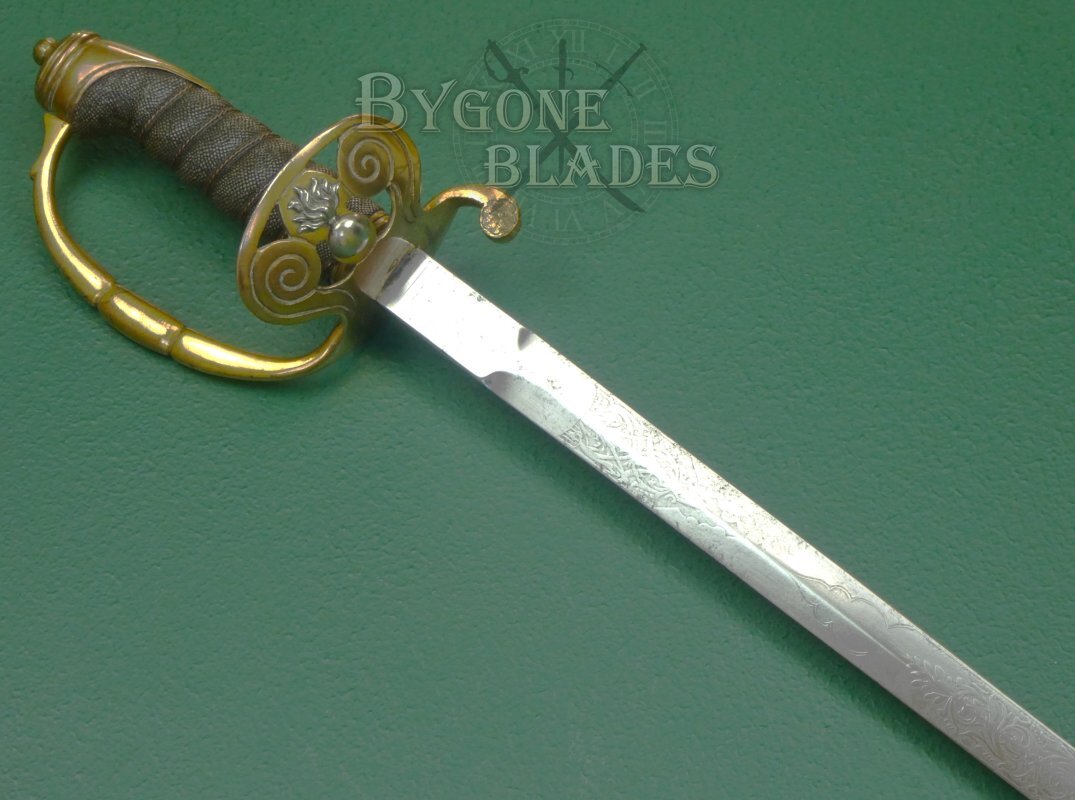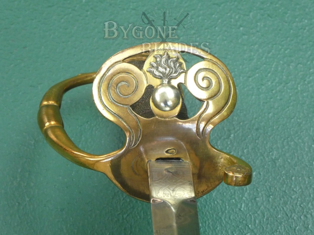 The gilt brass guard is in good condition and retains its gilding. The rear facing quillon is stamped with a flower and the front of the guard bears the regimental flaming grenade. The shagreen grip is in good condition and the twisted wire is intact and tight. The blade is firm in the hilt.